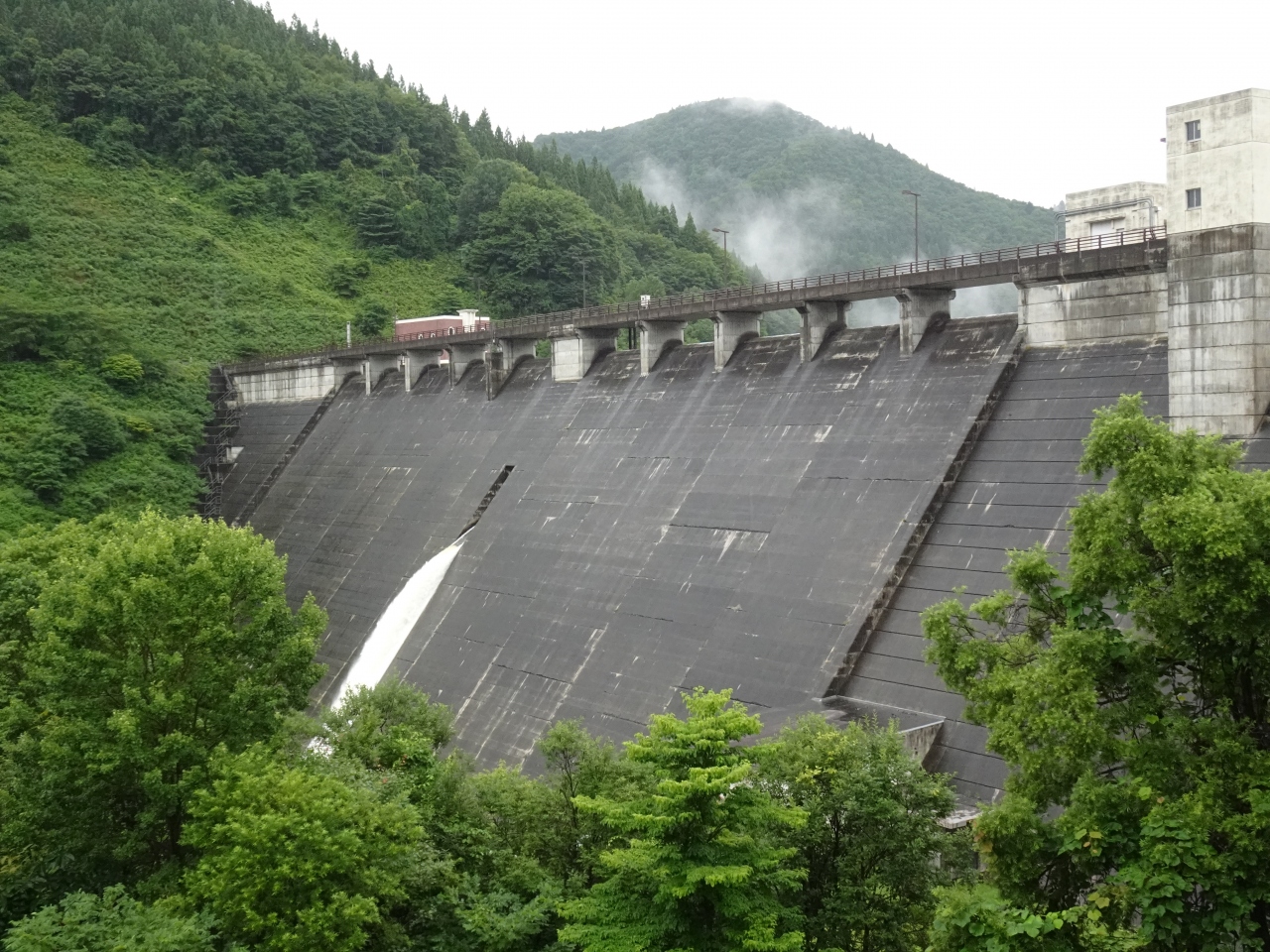ダムの少し手前に駐車場と公衆トイレを備える公園があり、堤体を眺めるには好都合です。堤高(57メートル)の割に堤頂長が317メートルと横長のため、オリフィスゲートからの放流が1本の細長い筋のように見えたのが印象的でした。