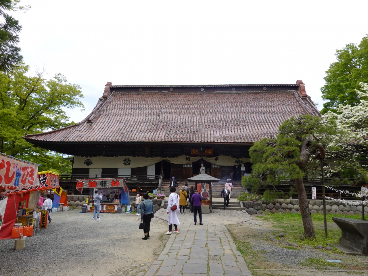 山形駅から北東に3キロほど、薬師公園のほぼ中央に「国分寺薬師堂」があります。国分寺は8世紀半ばに創建された歴史あるお寺で、薬師堂は大きく風格を感じさせる外観でした。ゴールデンウィーク明けに訪れたところ、日本三大植木市のひとつ「薬師祭植木市」が開催中で、薬師堂の周りにも屋台が並び、活気あふれる光景でした。