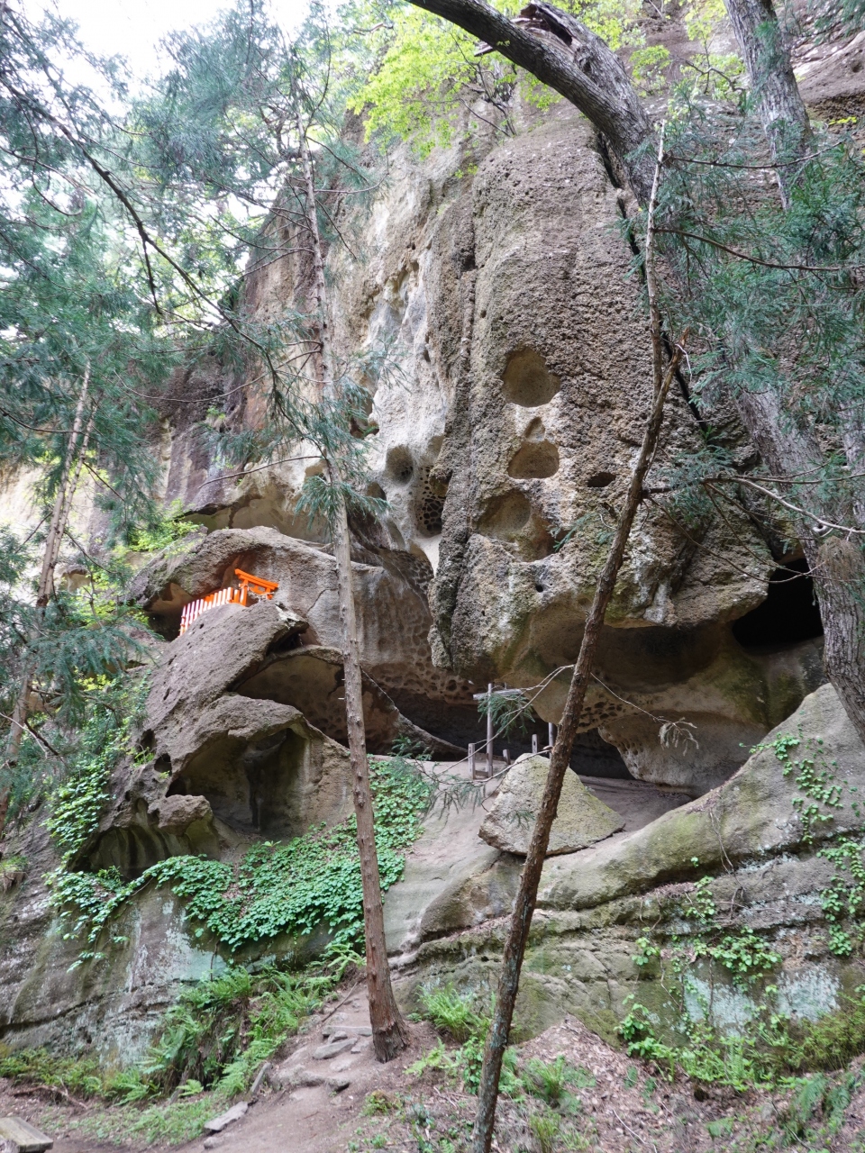 「山寺」のさらに奥地の“裏山寺”と呼ばれるエリアにある遺跡です。「立石寺 千手院」のすぐ近くから遊歩道が続いています。ハチの巣を想像させる奇岩とその近くに小さな赤い鳥居が並ぶ特徴的な光景が見られます。大正時代頃まではこのあたりで山伏が修業を行っていたというのが興味深いです。