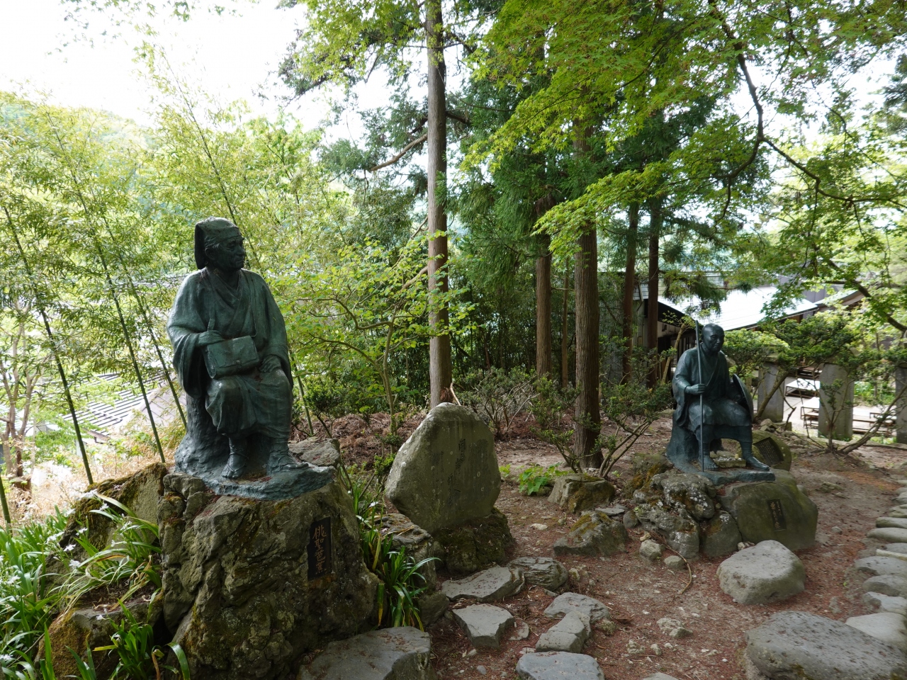 立石寺宝物殿の近くに、松尾芭蕉と奥の細道の旅に同行した門人・河合曾良の像があります。二人が距離をおいて座る姿からは、当時の旅の様子を思い描くことが出来ます。山寺には「せみ塚」という芭蕉の詠んだ名句にちなんだ記念碑もあり、ともに興味深く拝見しました。