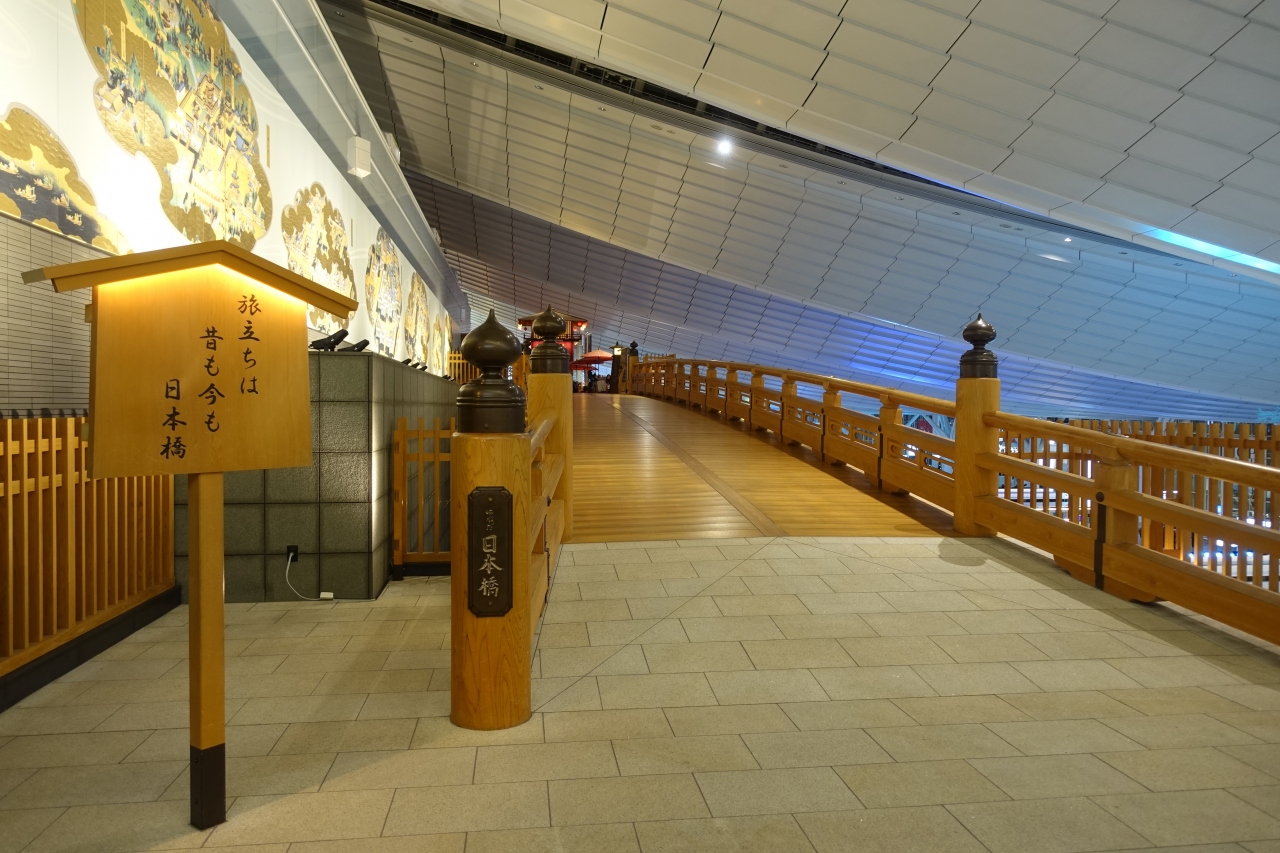 国際線ターミナルにある1/2サイズの日本橋。昨年の同時期にはちょうど工事中で渡れませんでしたが、今回はちゃんと渡れました。ヒノキを使用したかなりしっかりした造り。1/2とはいえ結構大きく感じます。だいぶ高い所にあるので、下のチェックインカウンターなどが見えて眺めもなかなか。
