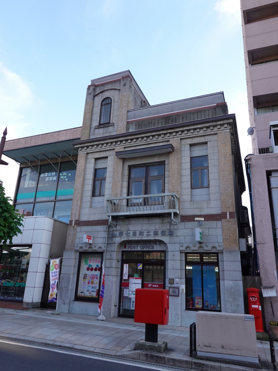 山形市街中心部にある現役の郵便局です。局舎は大正14年に洋品店として開店した建物を使っており、鉄筋コンクリート造の剛健そうな外観が特徴です。局舎のすぐ脇には円柱形の赤い郵便ポストが配置され、歴史ある建物とのマッチングが素晴らしいと感じました。
