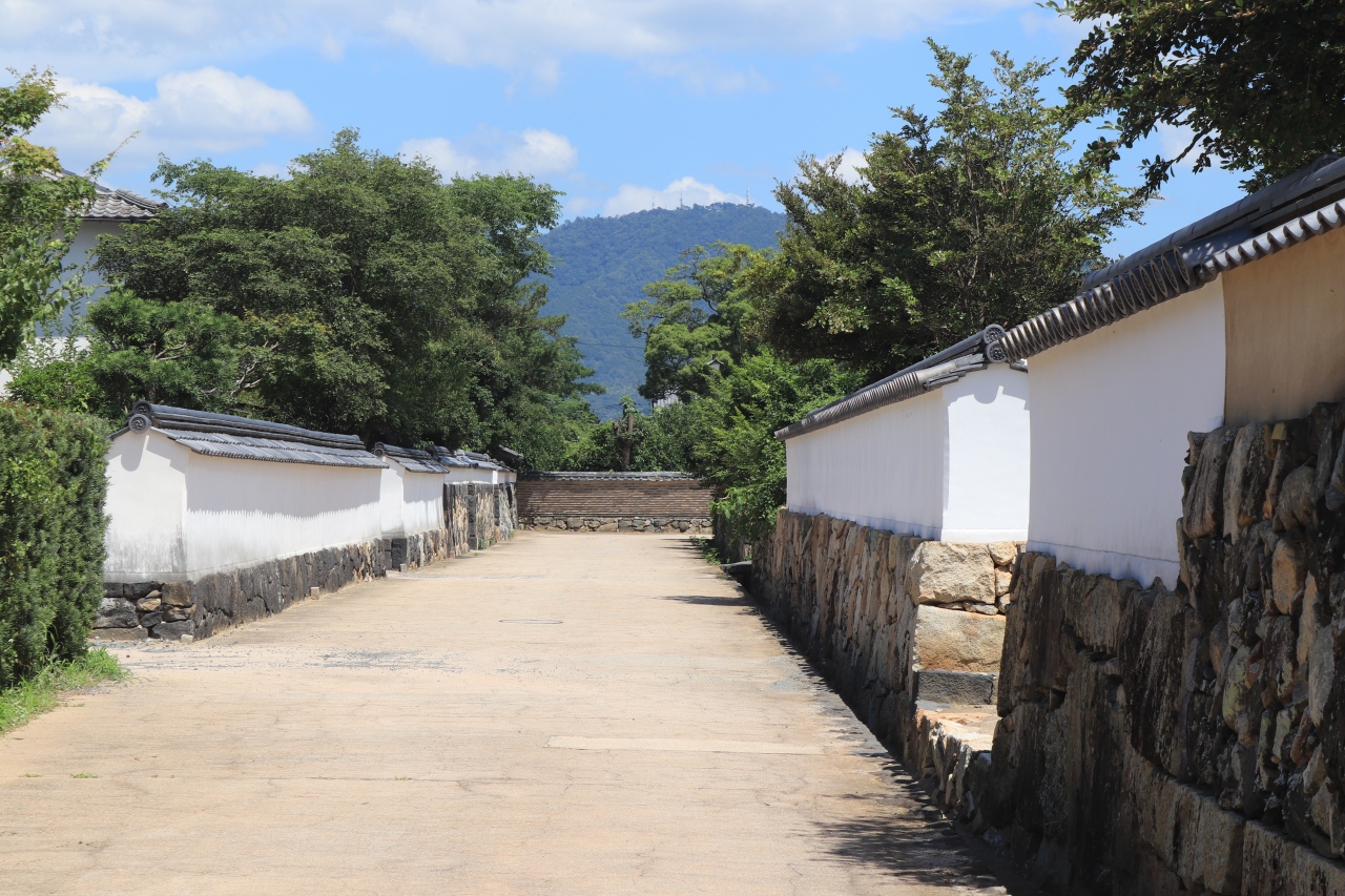 武家屋敷の口羽家住宅を見学したあと、城下町散策で訪れました。鍵曲とは、左右を高い土塀で囲み、道路を直角(鍵の手)に曲げた箇所で、進入する敵を迷わせたというつくりになっています。白壁の道を進むとぶつかりました。