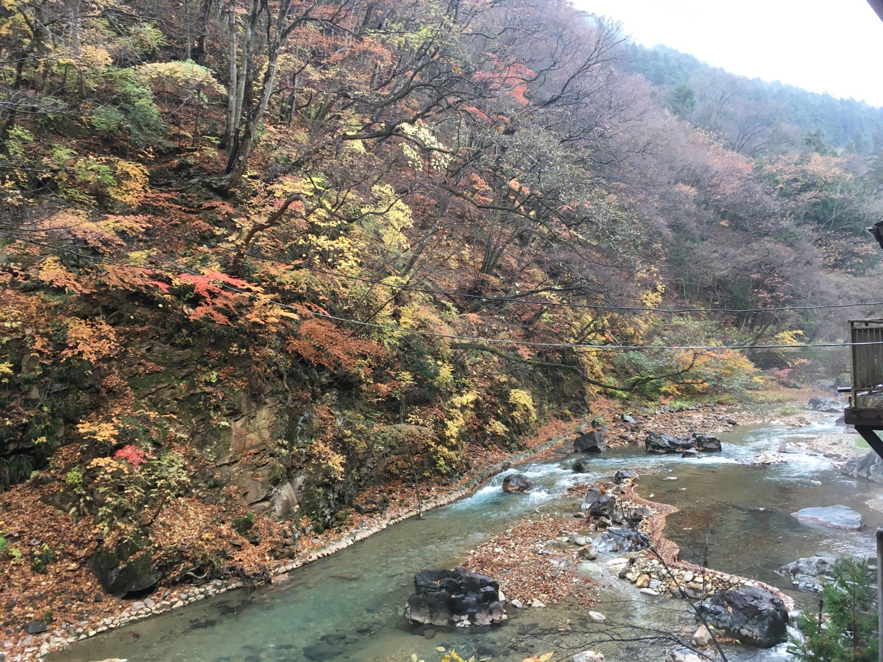 山に囲まれたロケーションになっていて、紅葉の綺麗な温泉街でした。車で行きましたが、ホテルや民宿には駐車場がありました。他にも広めの道路には、一時駐車して紅葉狩りを楽しむことができました。日帰りより宿泊がおすすめです