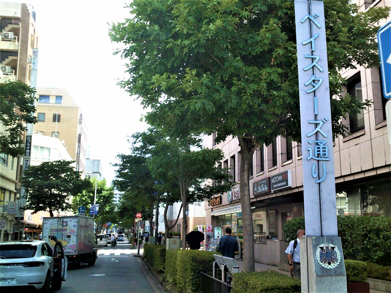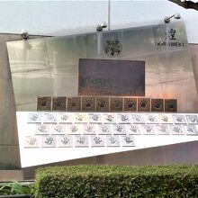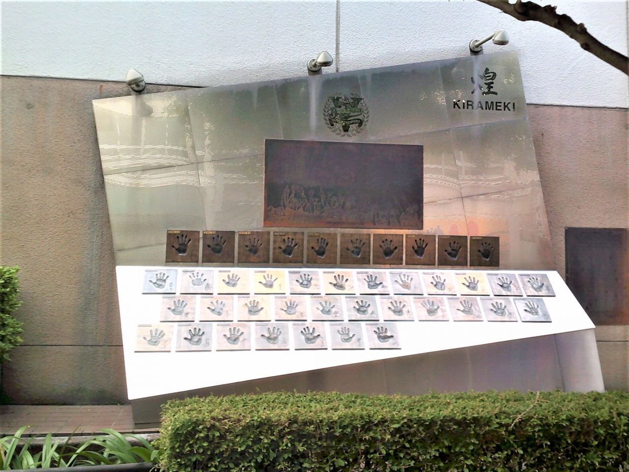 横浜公園/横浜スタジアムから歩いて5分弱で、小道(一方通行)のベイスターズ通り沿いtに<横浜ベイスターズ優勝記念モニュメント 煌>がありました。1998年、日本一になった時に横浜ベイスターズの優勝記念碑;Vの絵文字/胴上げ銅板プレート/選手手形が♪