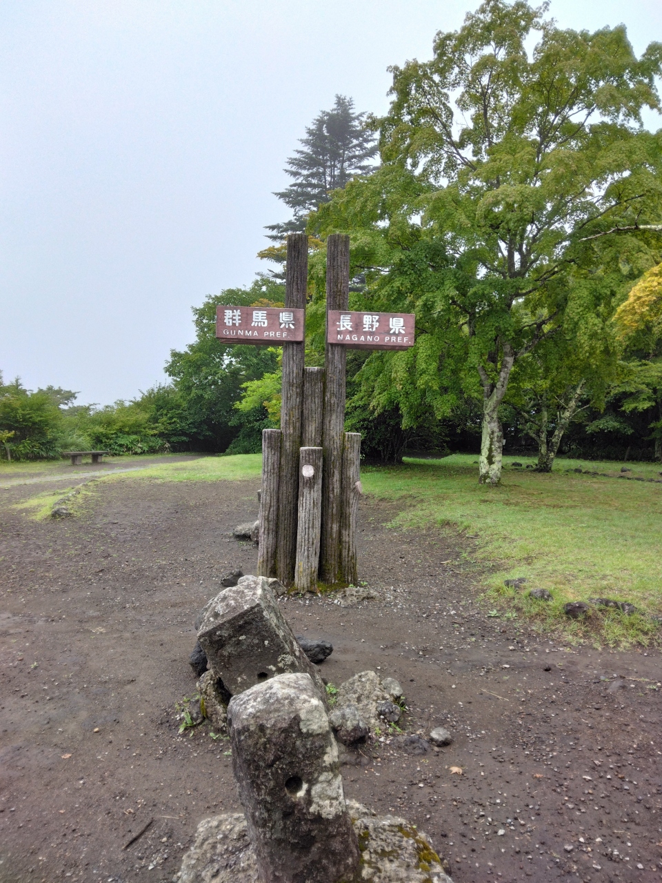 あいにくの天気で何も見えませんが、県境に沿って柱があり表示があります。帰りは遊歩道を歩いて旧軽井沢銀座まで軽いハイキングで途中つり橋もあったり、楽しく歩けます。さすがに軽井沢は涼しくて8月なのにさほど汗もかきませんでした。