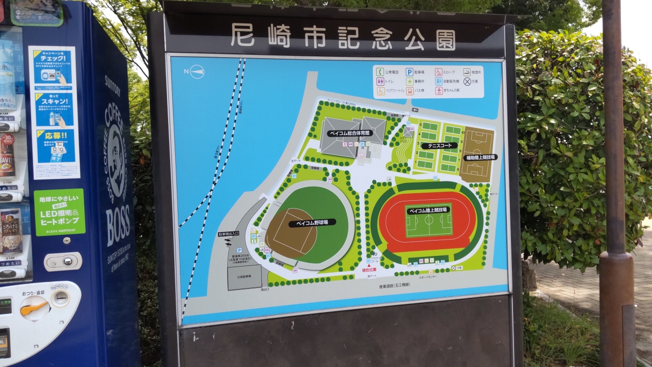 記念公園は、JR神戸線尼崎駅から西へ徒歩約10分のところにあります。7月に訪れました。総合耐区間、野球場、陸上競技場、テニスコートなどの設備がある運動公園です。1980年に完成した施設でさ、様々なスポーツ大会、イベントなどが開催されているとのことです。
