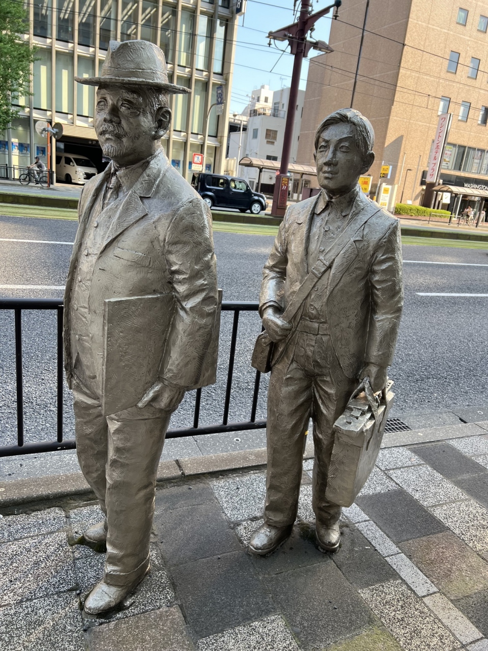 黒田清輝と弟子の銅像が歩道上に設置してあります。弟子の名前は書いていなかったです。特にこれを取り上げたということは1914年の桜島の噴火というのはとりわけ大きかったのでしょうかね。実際に桜島方面へ歩いている向きになっていました。