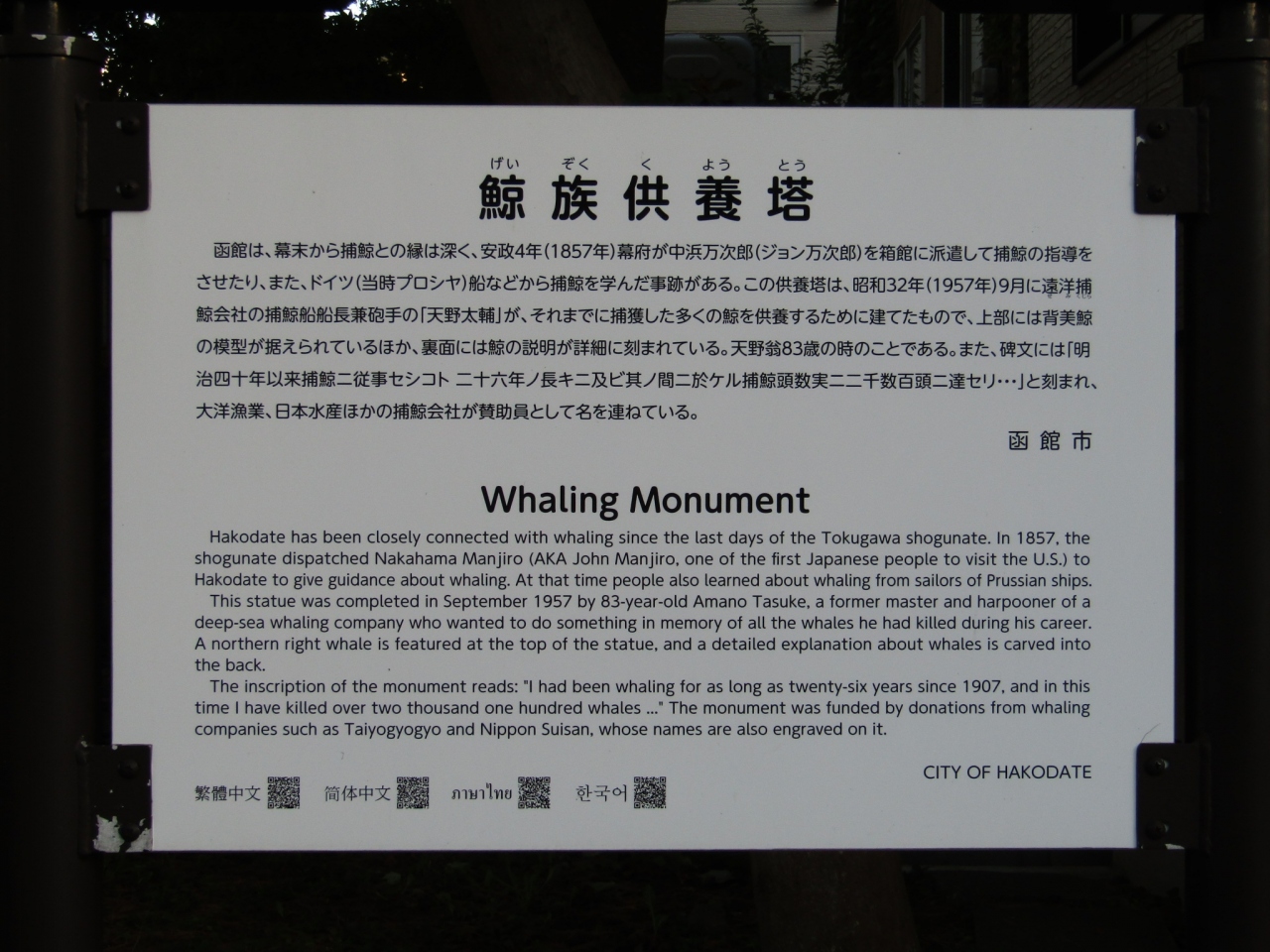 説明板があり、「捕鯨による多くの鯨を供養するために、1957年に大洋漁業や日本水産などの捕鯨会社により建立された供養塔」だそうです。