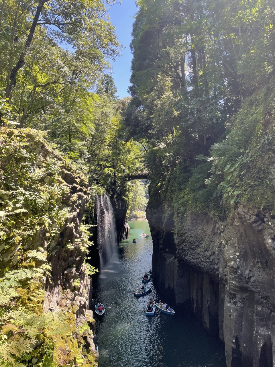 高千穂峡の代名詞。展望台から眺めも素晴らしいですが、あまり広くなく、人込みも多いので、ゆっくり観光はできません。写真でよく見るtのは上からとったものですが、ボートから見上げる形で見た方が迫力があり、私は好きです。これだけのために高千穂に来たかいがあります。