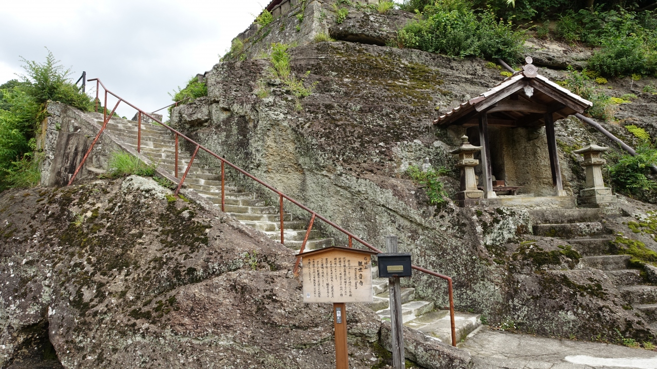 観世音寺は江戸時代には銀山隆盛を祈願するために建立された。現在は山門と本堂のみが残っている。大森集落のほぼ中央の小高い岩の丘(と言っても石段を二十段程度の石段を上るだけ)に建っているので、ここに上ると赤い石州瓦が軒を並べる大森集落を一望できる。