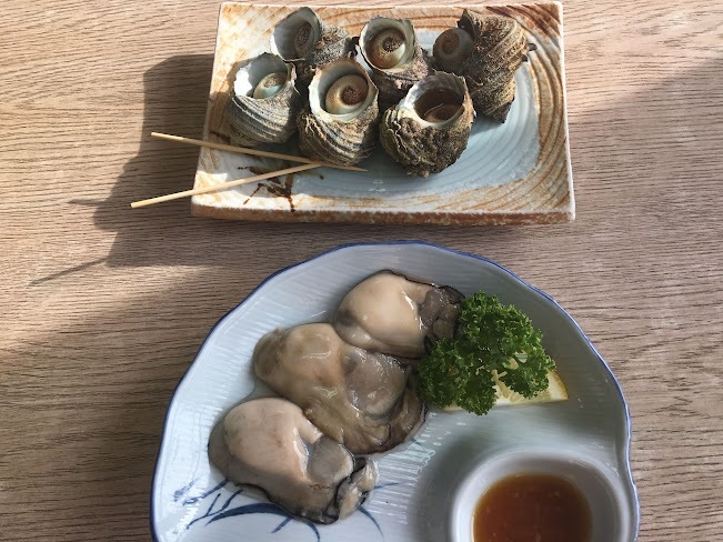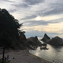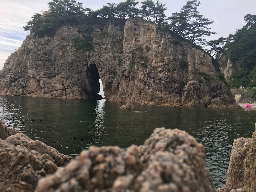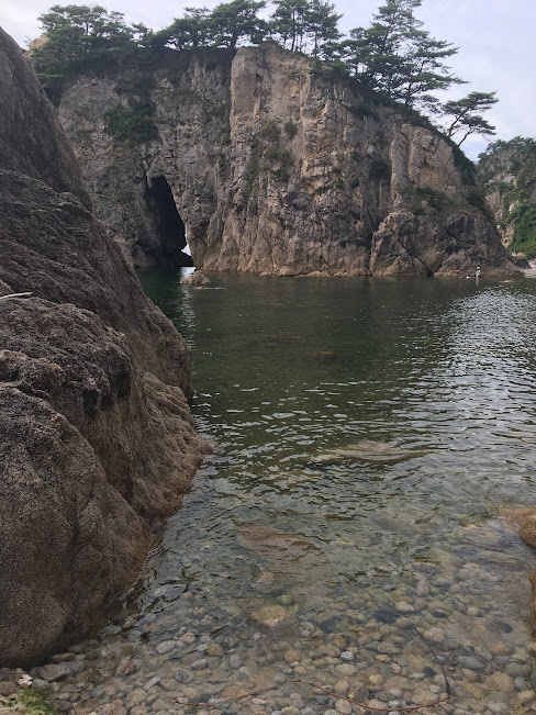 国の名勝笹川流れ。荒波の浸蝕でできた奇岩が立ち並びます。笹川海水浴場では子供連れの家族でにぎわっていました。ちょっと影の方(海水浴場から離れると)独特な雰囲気がありました。牡蠣やツブが獲れるそうです。近くのお店で食べた貝類は絶品。