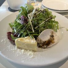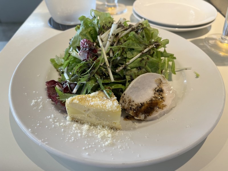 気まぐれサラダは野菜たっぷりに、スペインオムレツ、鶏むね肉が添えられる