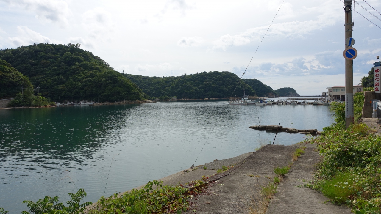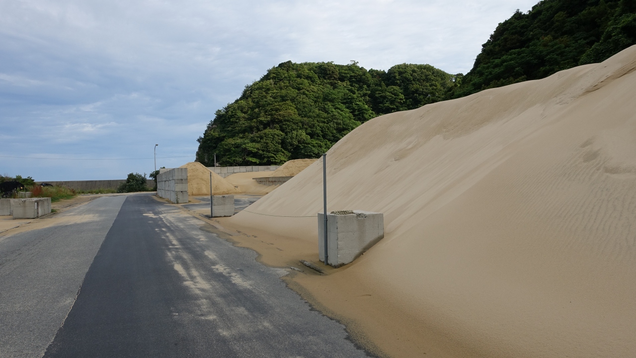 日本海から深く入り込んだ入江なので波もなくとても穏やか。対岸の山の緑が海面に映り緑に見える。ここに白い小さな漁船が停泊している風景は一幅の絵画のよう。温泉津温泉から沖泊集落へは海岸線の道を歩いたがとても気持ちがよかった。道の途中に積み上げられた海砂は驚くほどキメが細かかった。