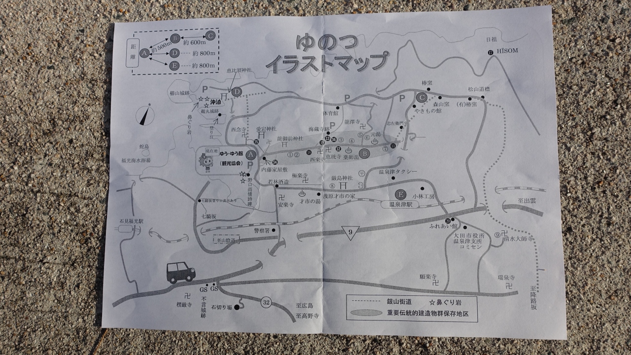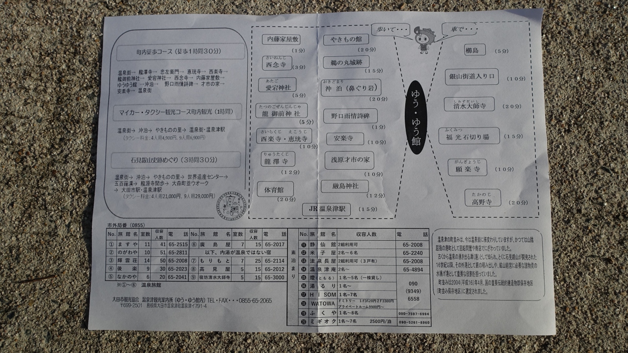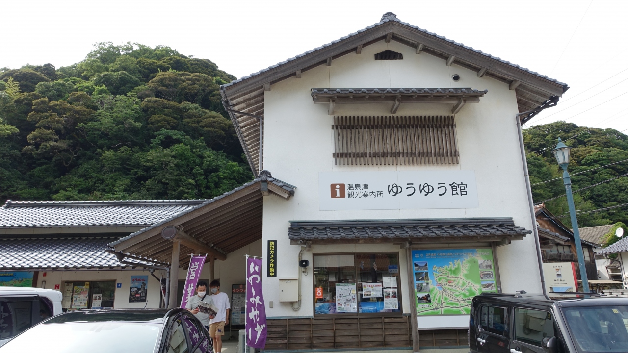 JR温泉津駅から10分ほど歩くと温泉津湾を望む広場が現れ、その一画に観光案内所「ゆうゆう館」がある。一階は観光案内所と特産品の展示場、二階は歴史資料館になっている。重伝建にも指定された温泉津温泉に入口にもあたる。温泉街は道も狭く駐車スペースがないので、車で訪れた時は広場の駐車場を利用する。