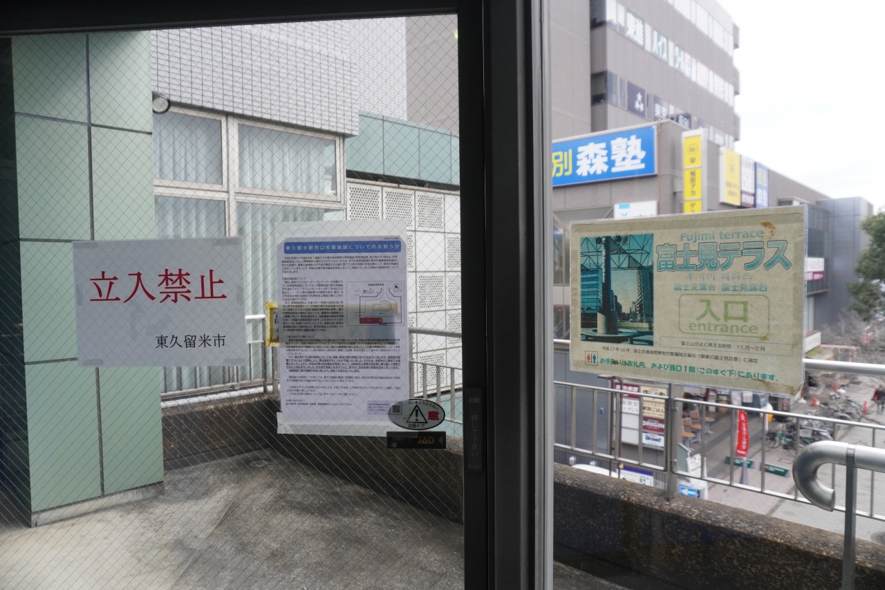 富士見テラスへと向かう入り口は改札を出て右手の方行き当たりにあるのですが、現在はコロナ禍のために閉められていました。そこまでして何か意味があるのかなという気もしますが、はっきり立入禁止と書かれているのでどうしようもありません。