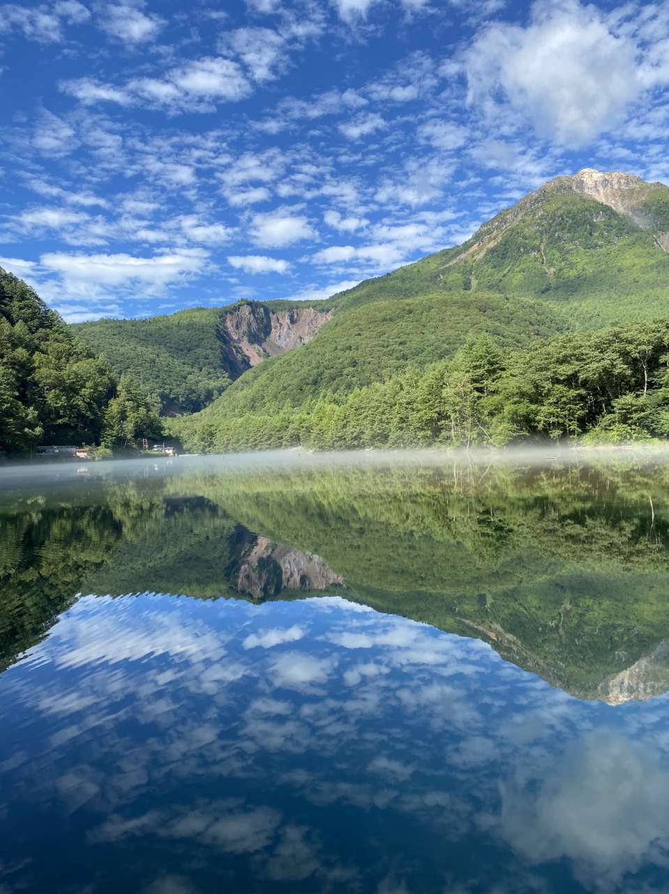 早朝の大正池にはモヤがかかり、幻想的!涼しい!ススキが秋を感じられる。まだ8月ですが…
