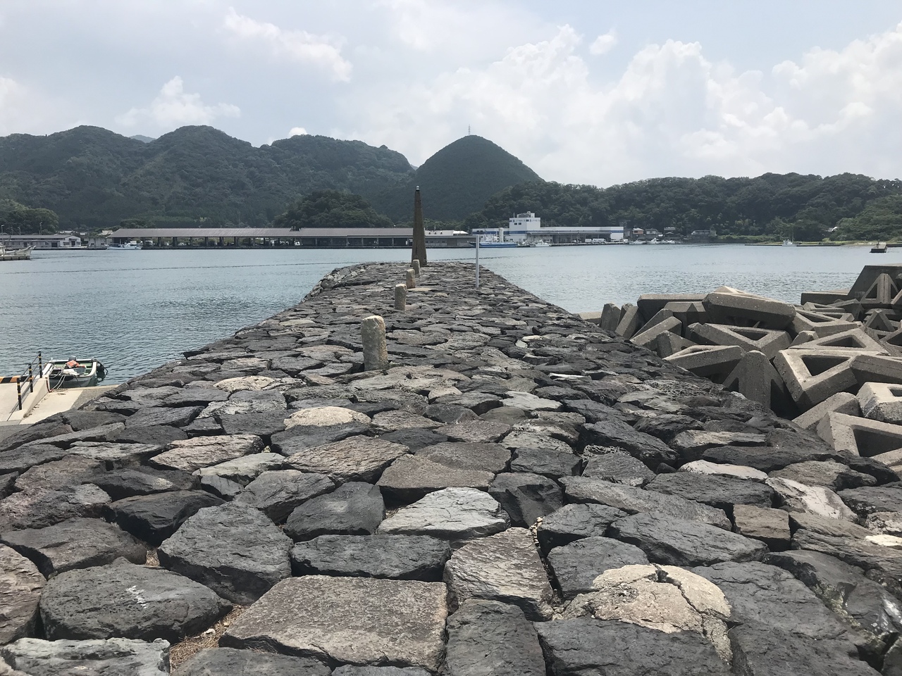 防波堤と発掘された跡が残る遺跡。