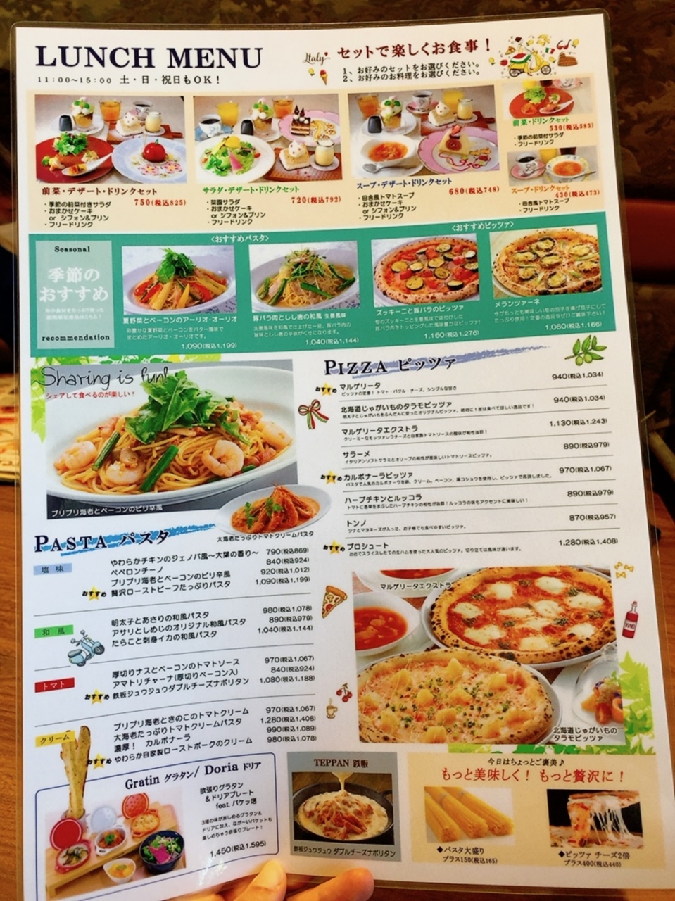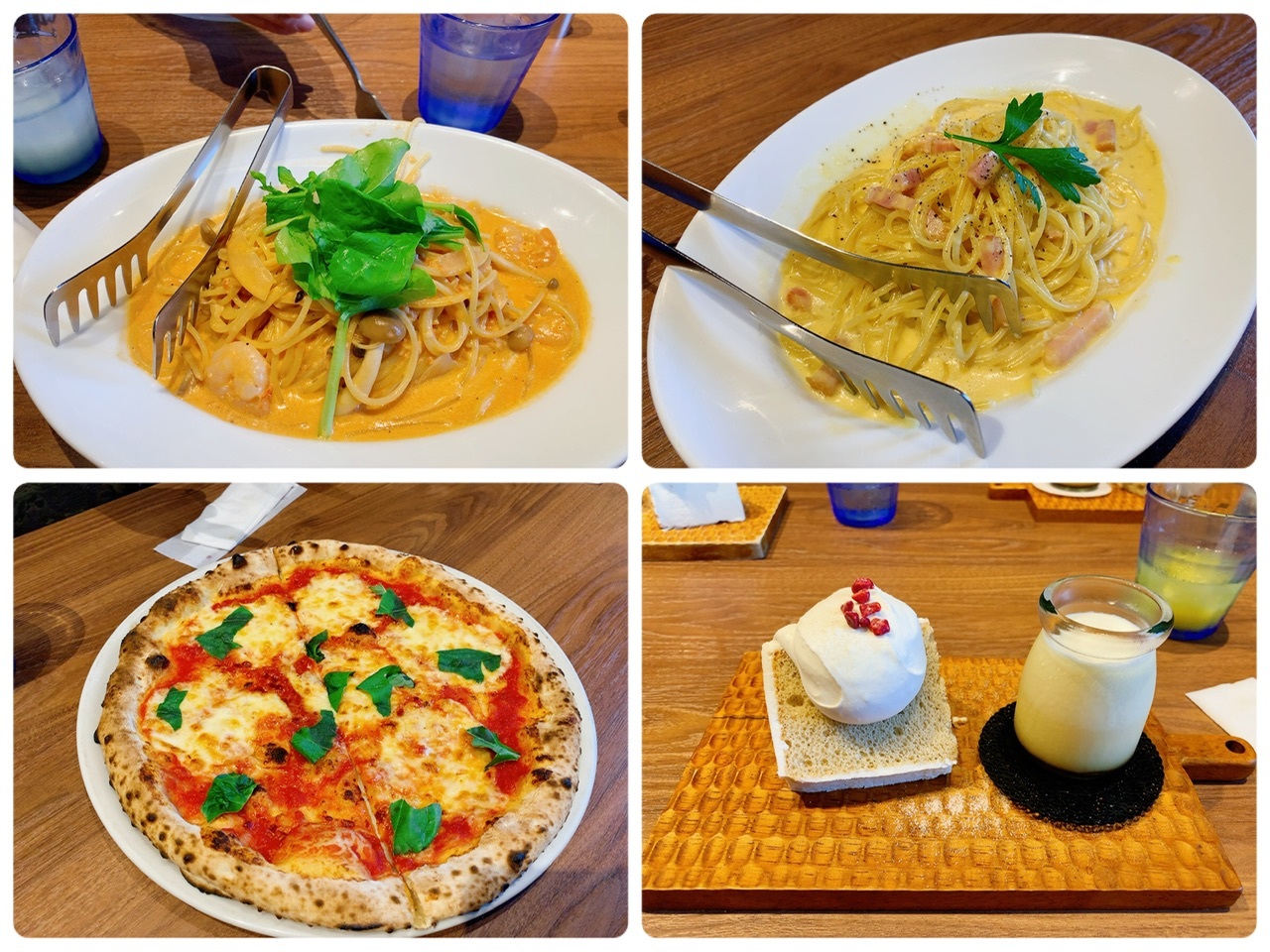 パスタやピザなど、色々なメニューがあり、それにスープセットやサラダセットなどを追加で付けられる感じです。 デザート付きのものは、基本がシフォンケーキ+プリン(両方つきます)ですが、入口で見かけたガラスケースに並ぶカラフルで美味しそうなケーキも追加料金で選ぶことが出来ます。