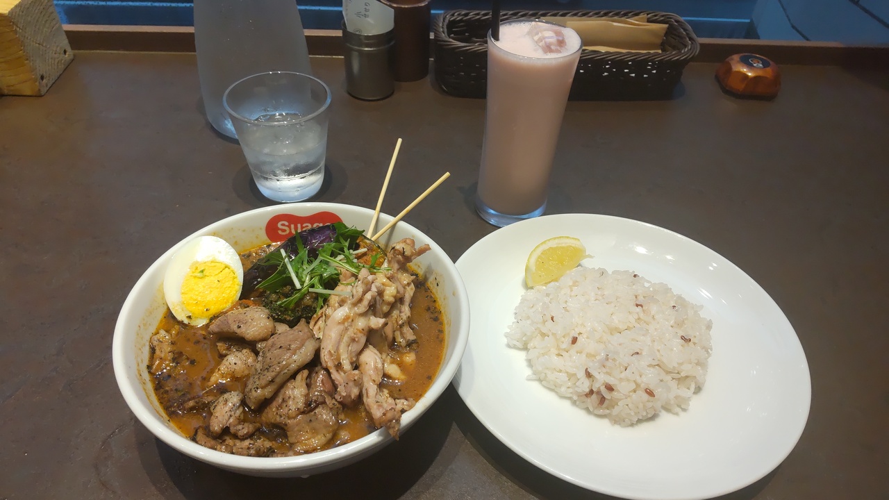 ラム炭焼きカレー、オーソドックスなすあげスープ、中辛、ライス小、トッピングに梅しそせせり。更に、ハスカップラッシーも注文。