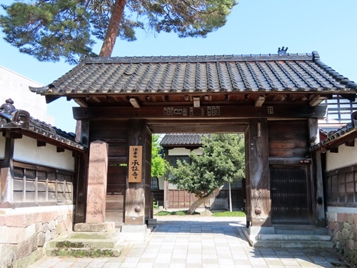 法華宗の寺院です。六斗の広見から北へ向かい(旧鶴来街道)、妙立寺のちょうど向かいあたりで門は西面しています。本山は京都の本能寺。加賀前田家初代・前田利家に願い出て金沢に寺地を拝領したのは「本能寺の変」の7年後、1589年(天正17年)。豊臣秀吉の命によるこの本山の移築は1591年(天正19年)ですから、そんな時期に末寺として創建することもあるんですね。本堂板戸に描かれた絵は、江戸時代の画家・俵屋宗達の晩年の作なのだそうです。