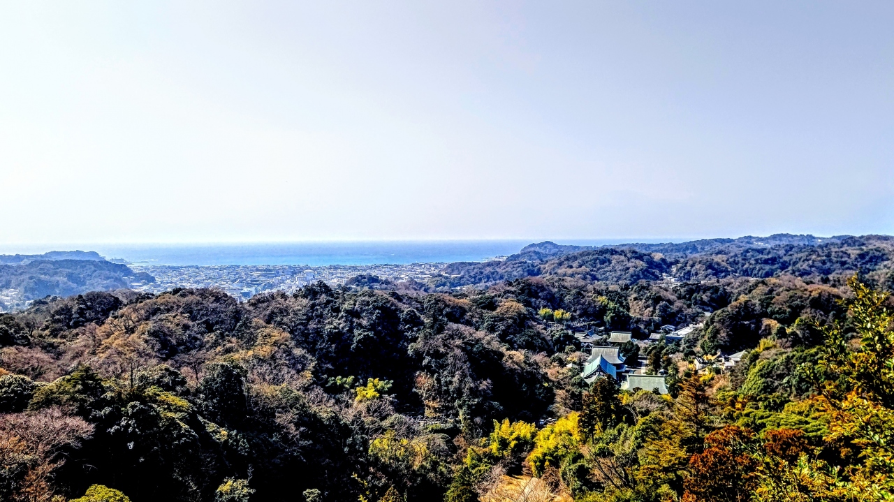 建長寺の半僧坊を目指して階段を登っていくが、思っていた以上に急な階段でかなりしんどい。そこからさらにこの展望台に行くにはハイキングコースを登っていくひつようがあるので、時間もかかるし、体力も使う。しかし眺めは相模湾展望台よりもはるかに良い。
