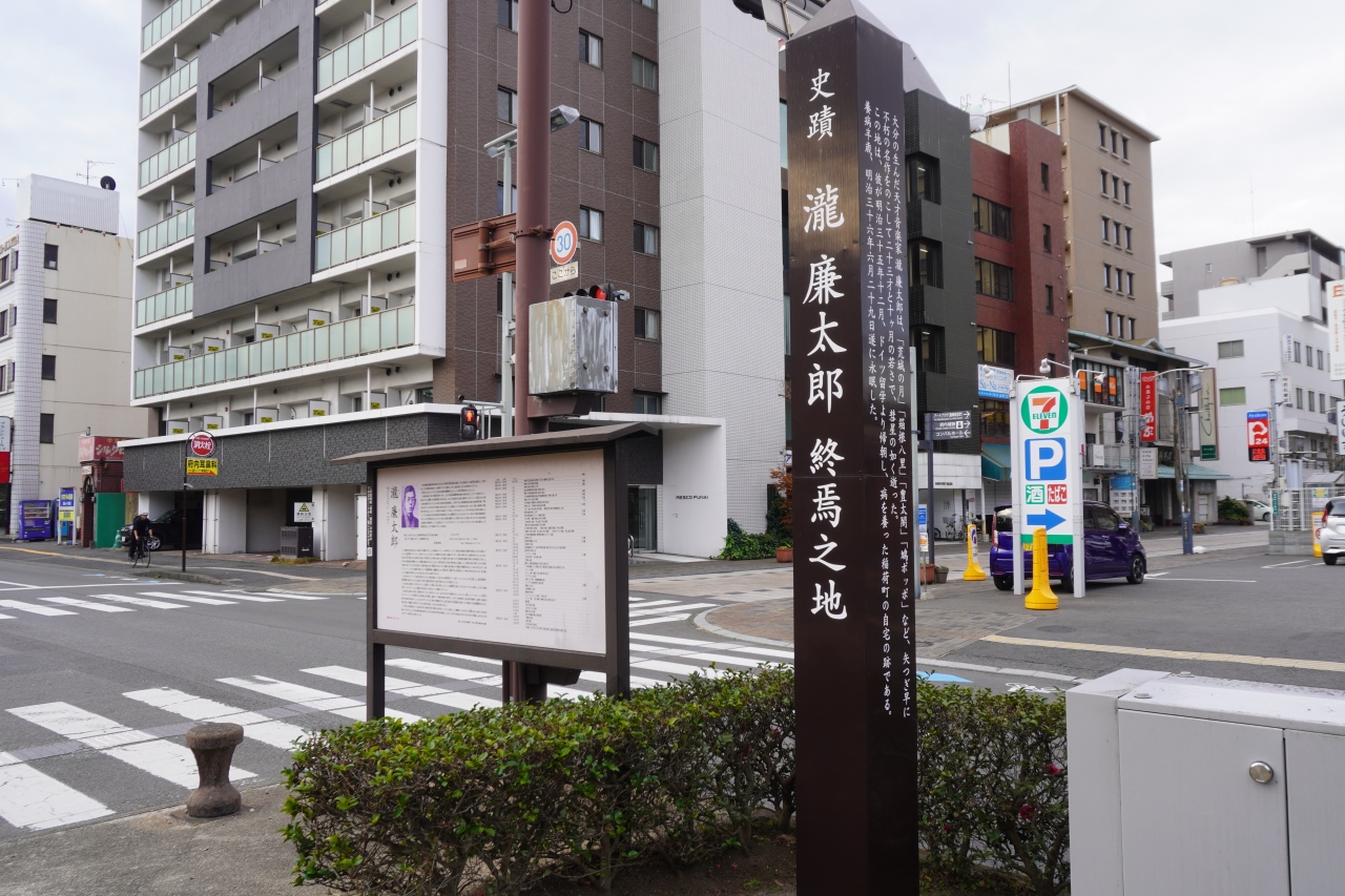 瀧廉太郎終焉の地は、城址公園の南側に延びる遊歩公園の南端。南蛮文化に関係するモニュメントが続くその最後のところで、それを示す標柱が立っていました。ここは、瀧廉太郎が最期を過ごした自宅があったのだそう。明治36年、23歳の若さでした。