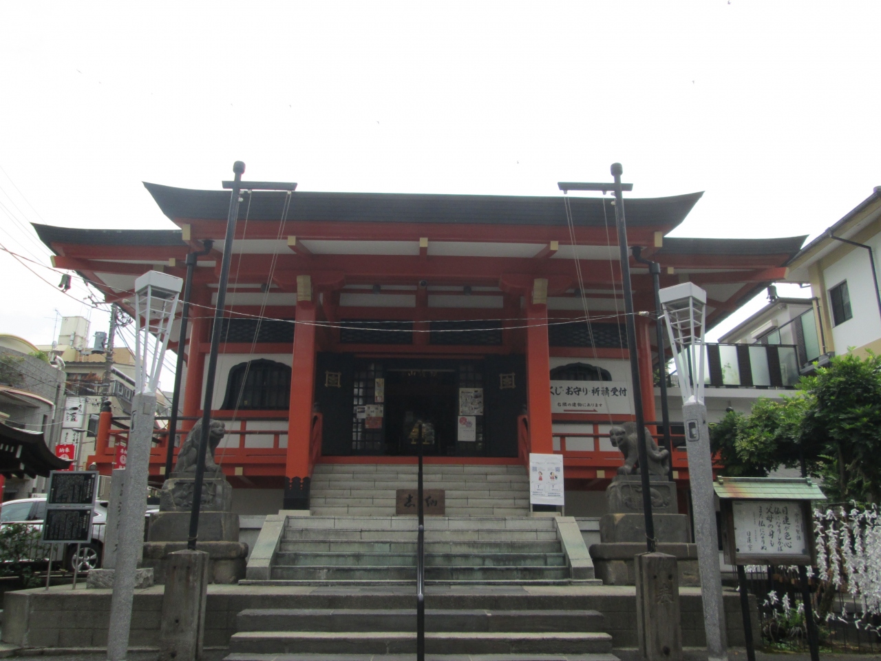 日蓮宗の一寺、創建は1595年、開基は徳川家康、開山は仏乗院日惺上人、本尊は宗定本尊です。拝殿前の左右に一対の石虎像が見られます。この像は区指定有形文化財になっています。神社拝殿前(例は少ないようですが寺院にもある)には、良く狛犬または狐像(稲荷神社)が鎮座しているのを見かけますが、虎像は初めて見ました。これらの像は本堂または本殿を悪霊から守るための魔除けとされています。虎像にも口を開けた阿形像(拝殿向かって右側)と口を閉ざした吽形像が見られます。訪れた際には口元をよく見てください