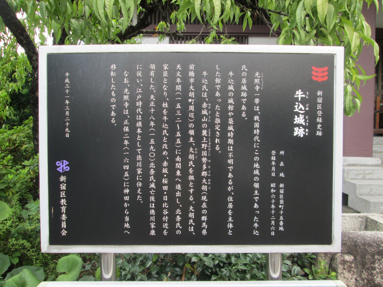 浄土宗の一寺、創建は1603年、開基は松平信定、開山は清誉上人光照、本尊は阿弥陀如来像です。山門を通ると、鐘楼、本堂、地蔵尊、文化財や登録史跡の説明板等があります。出羽松山藩の菩提寺で、境内には同藩初代藩主酒井忠恒を始め歴代藩主の背の高い立派な墓が建っていて圧倒されます。また光照寺一帯は牛込城があったとところと言われています。牛込城の築城年は1532~1555年、築城主は牛込勝行です。残念ながら、境内に牛込城の説明版が建っているのみで、遺構は全くありません。地蔵坂の坂上に光照寺はあるので、高台にあるところから城址だったと想像するしかありません。