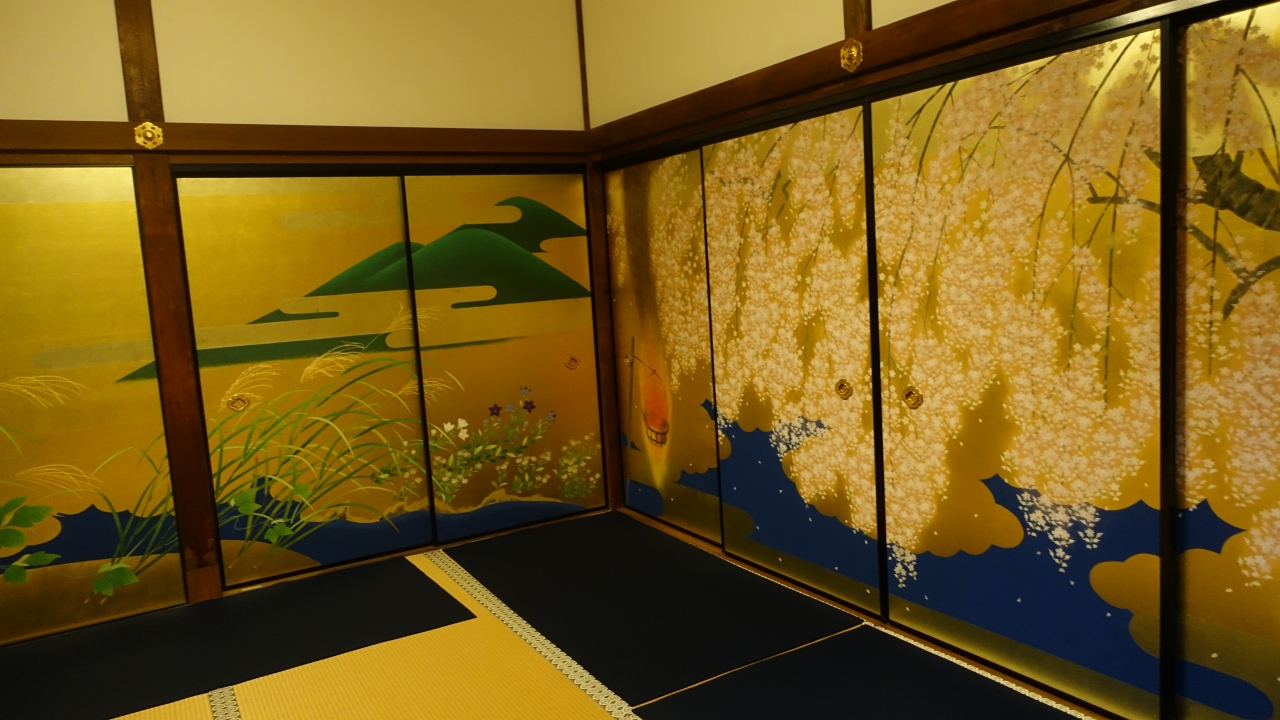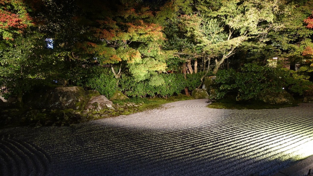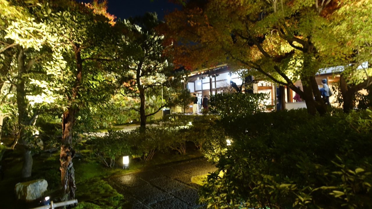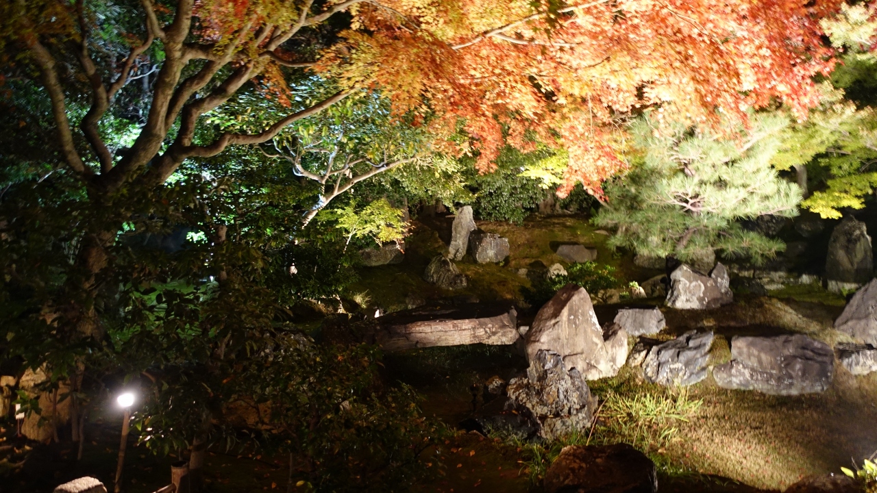 方丈には長谷川等伯の襖絵を始め大正から現代にかけて活躍した画家たちの襖絵がずらりと並び見ごたえがある。方丈から眺める南庭は木々に岩と砂を配した枯山水庭園で紅葉と常緑樹のコントラストが美しい。坪庭を見ながら奥に進むと平安時代の和歌を掲げた小部屋「歌仙堂がある。その奥に伏見城から移築した北庭がある。池泉回遊式の枯山水庭園でライトアップで闇に浮かび上がる石組みの上の紅葉が見事だった。