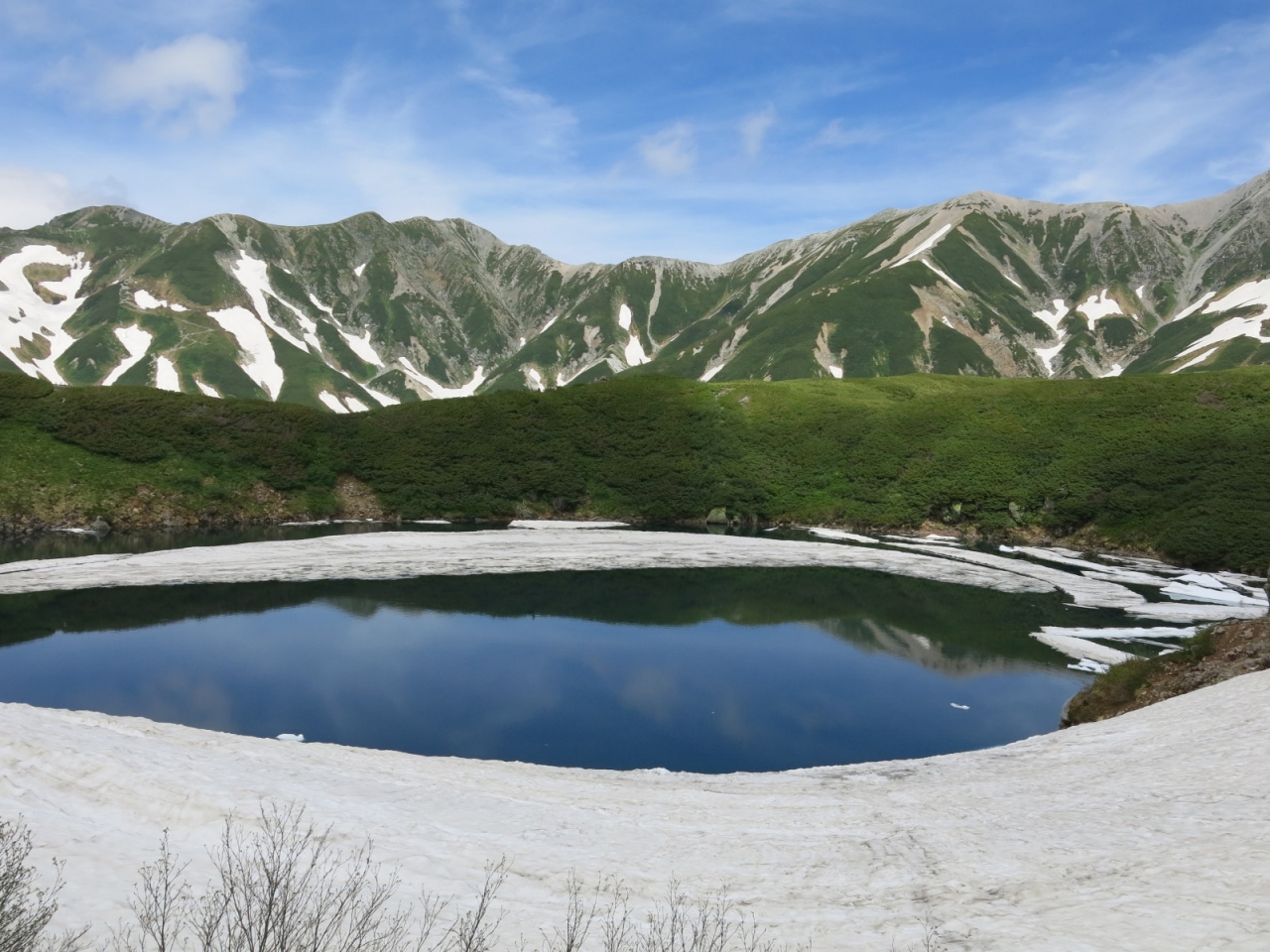 室堂平にある池ですが、初めて見るとその大きさは意外に感じると思います。散策路から湖面までかなり距離があり、そのことも大きく感じる一因かもしれません。