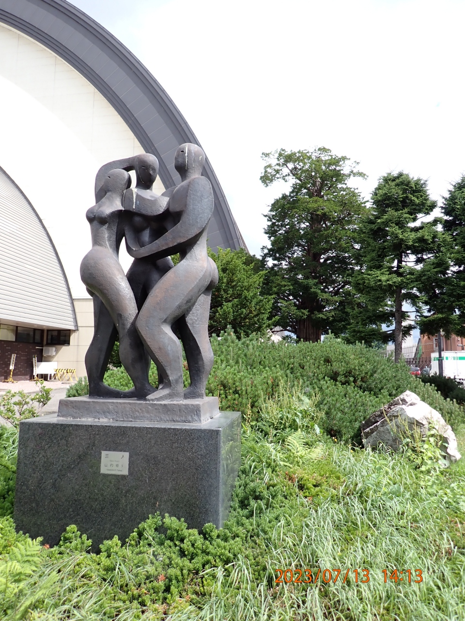 旭川観光で立ち寄りました。「三人」像は、旭川市内にあるたくさんの彫刻の一つで、大雪アリーナ前の広場にあります。山内壮夫(やまのうちたけお)さんの作品でした。山内壮夫さんは、岩見沢出身の彫刻家で、日本各地に多くの野外彫刻が設置されています。