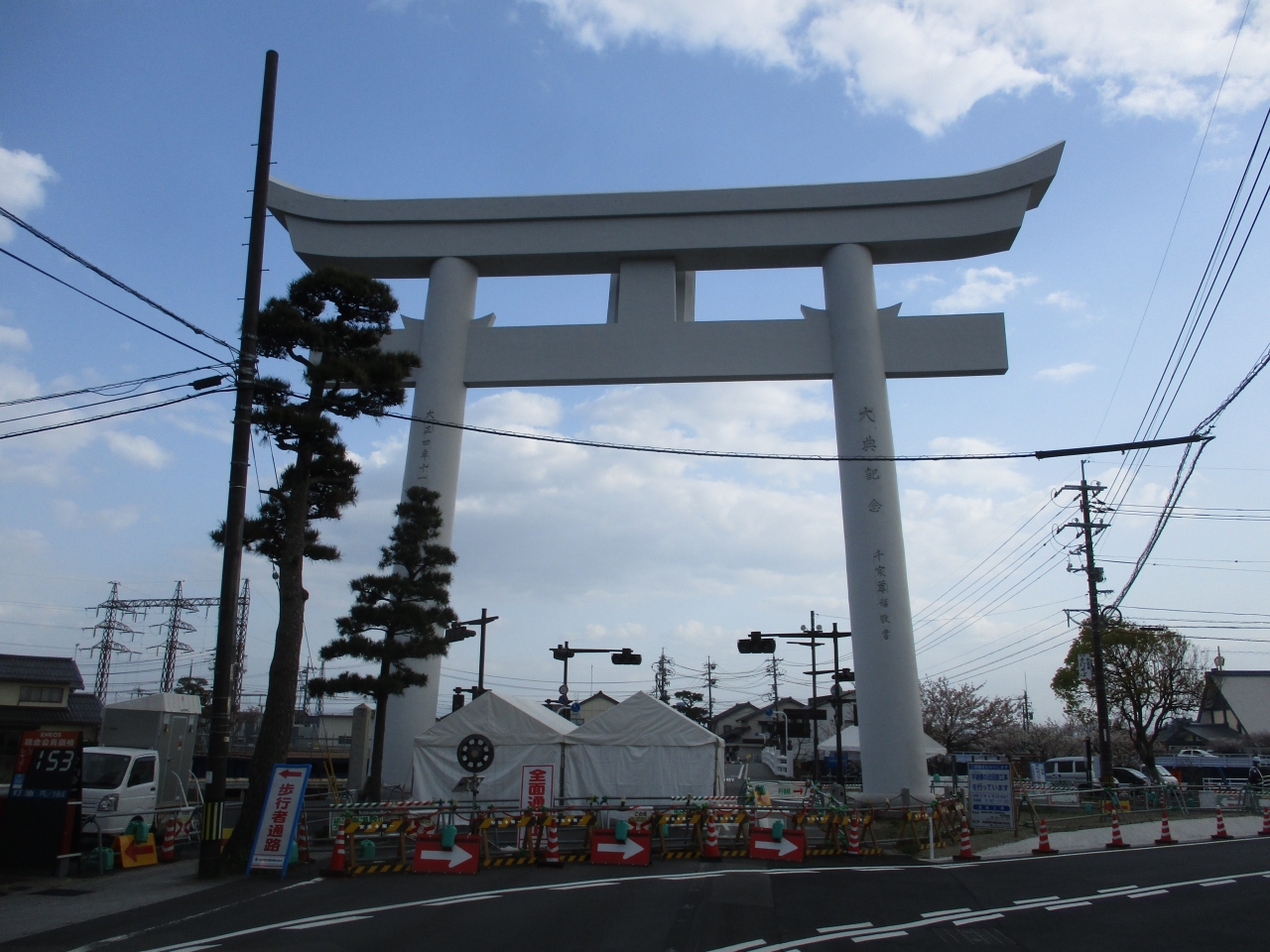 出雲大社を参拝すると、神門通りで高さ20メートルを超える巨大な大鳥居が目を引きます。1915年に建てられたようで、もう100年は超えている建築物です。近くに来ると、大がかりな大鳥居の補強工事とその下の公道幅を広くしているようでした。