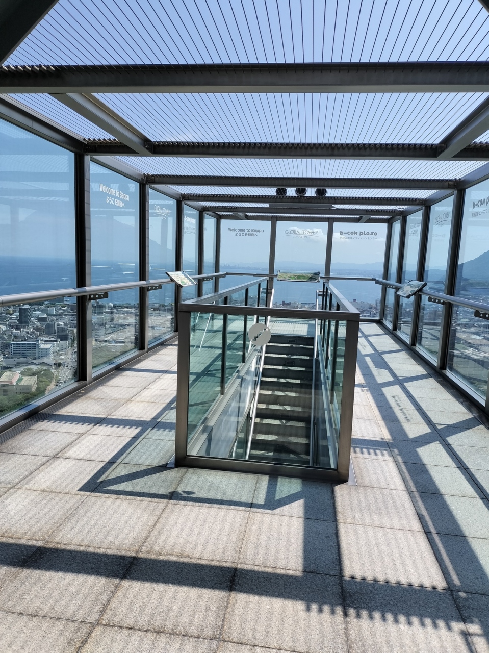 展望デッキは地上100mにあり、ガラスばりなので、360度見渡せます。別府を一望できます。