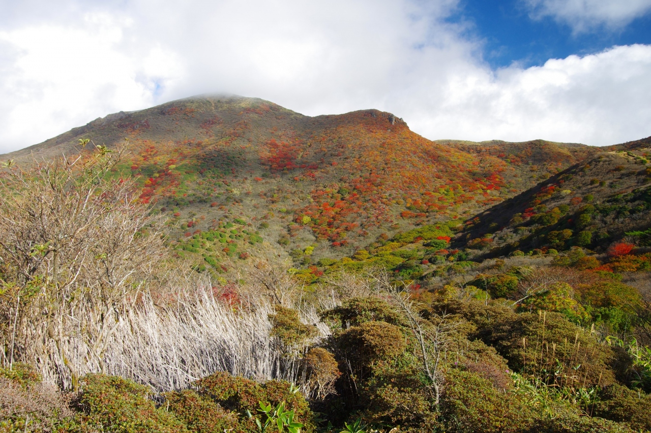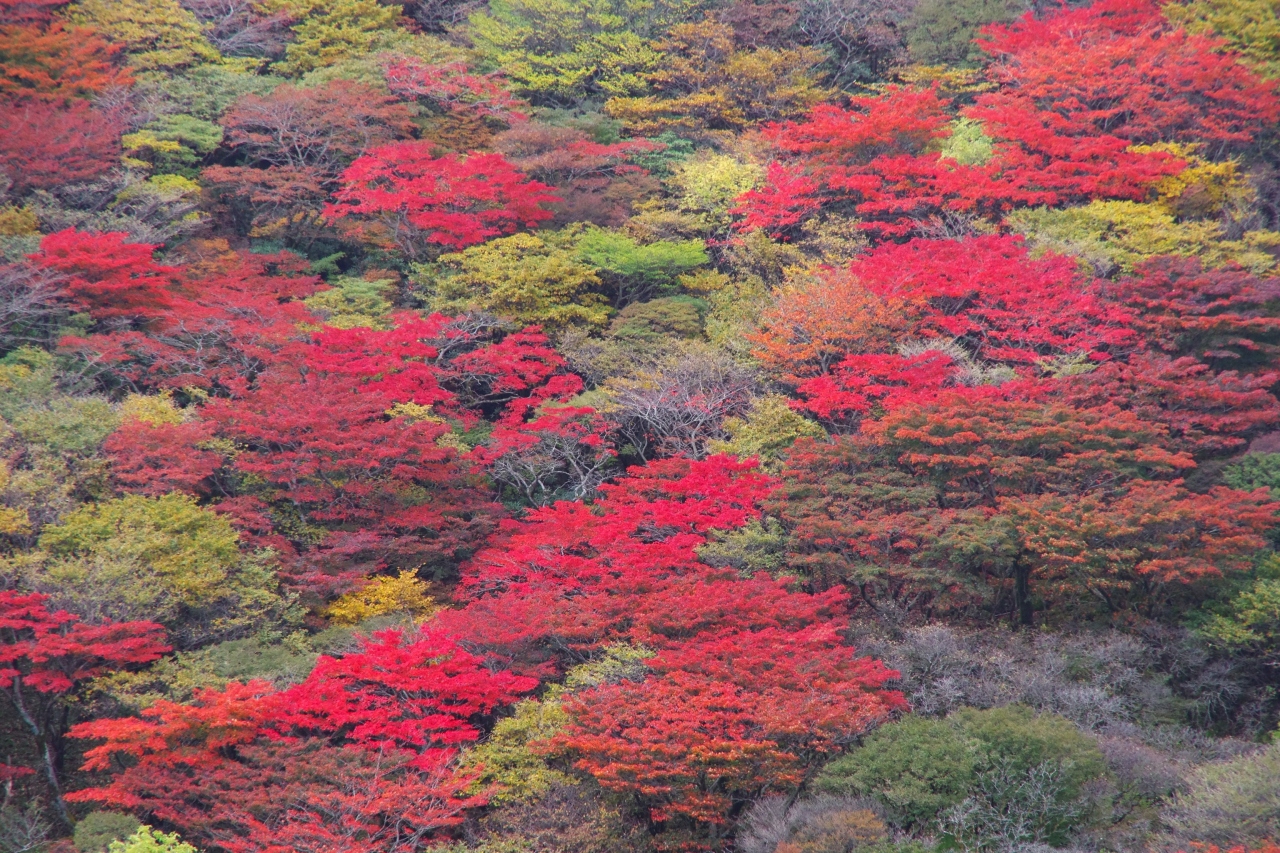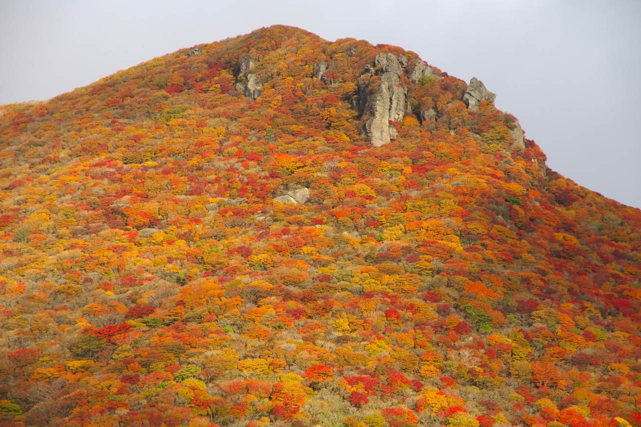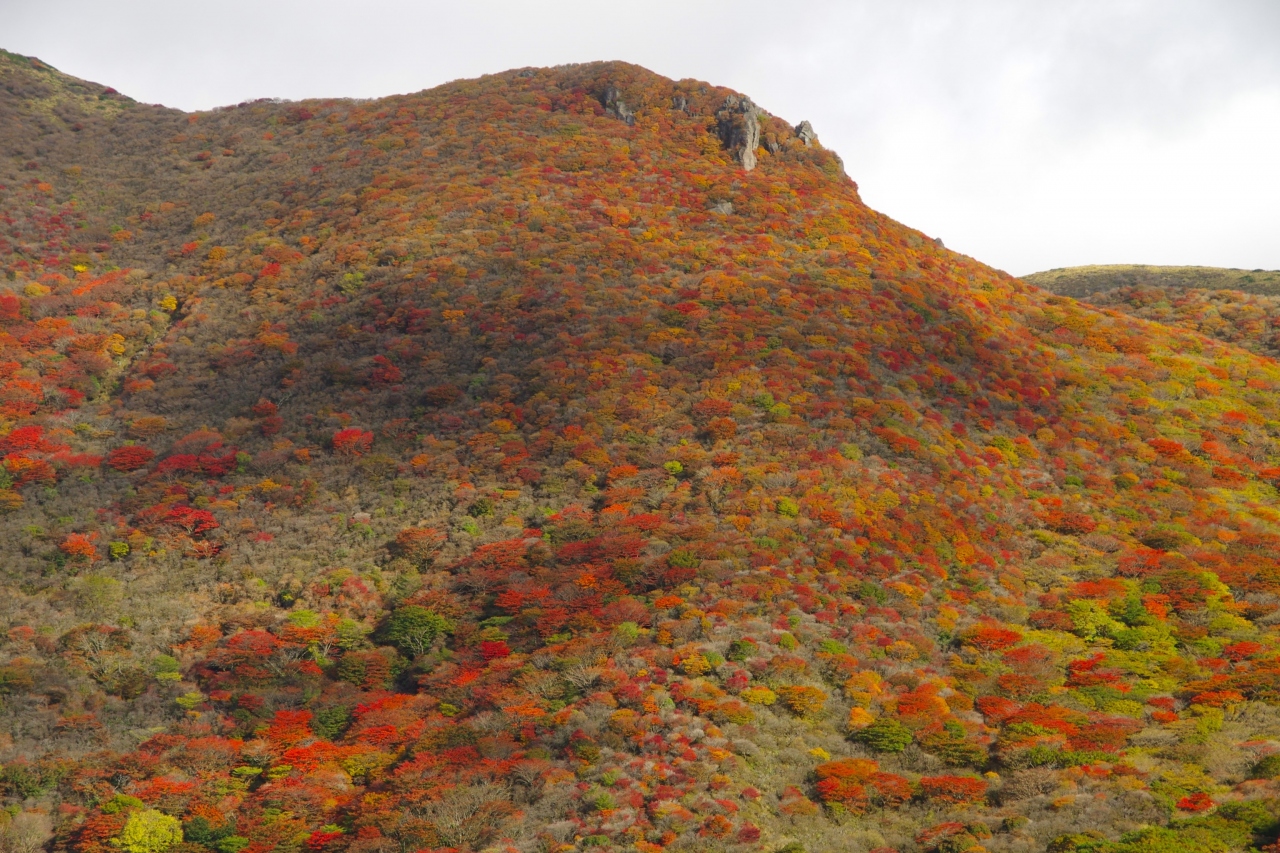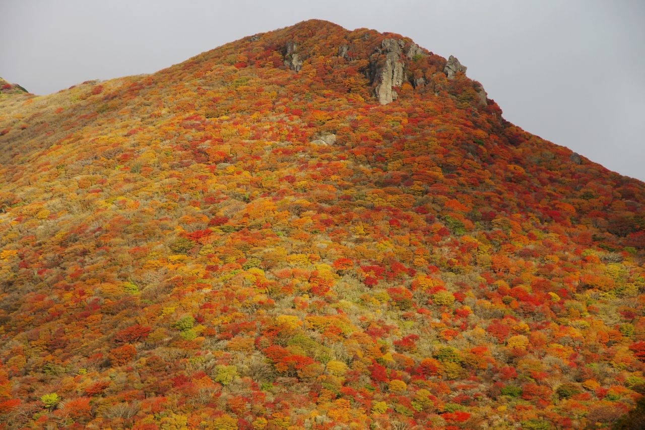 今回の九州北部旅で登山対象としたのは、由布岳・大船山(くじゅう)・阿蘇山の3つ。ただ、ここの紅葉の星生山がかなり素晴らしいことも情報として知っていた。そこで少し予定を変えて、午後の時間があるときを使って途中まで登って燃えるような山肌を見ることができた。
