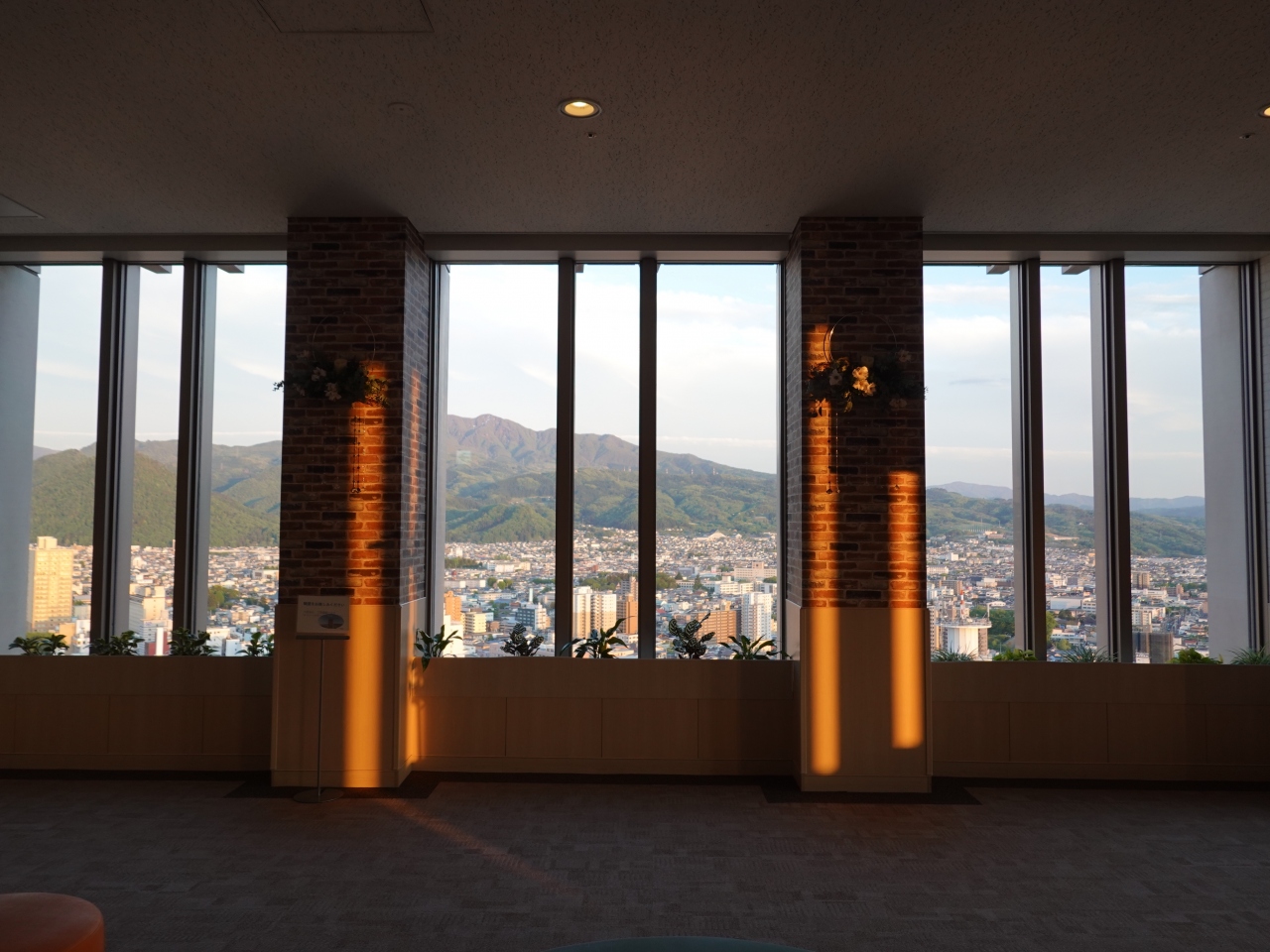 JR山形駅直結の複合商業施設「霞城セントラル」の24階に展望ロビーがあります。この近辺には高い建物がないので見晴らしは良く、周辺の山並みとともに、山形市街を眼下に一望することが出来ました。入場無料も嬉しく、平日ということもありほぼ人が皆無だったのも良かったです。