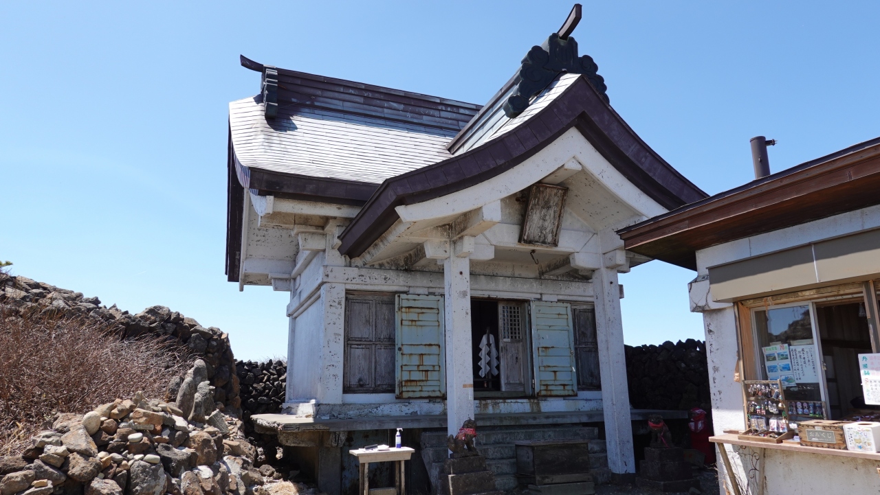 蔵王刈田嶺神社の奥宮は、刈田山の山頂にあります。山頂とは言っても御釜の駐車場から歩いてすぐで、楽々アクセスすることが出来ます。建物はやや傷んでいますが、濃い青空を背景に、真っ白く塗られた社が映えていたのが印象的でした。