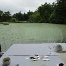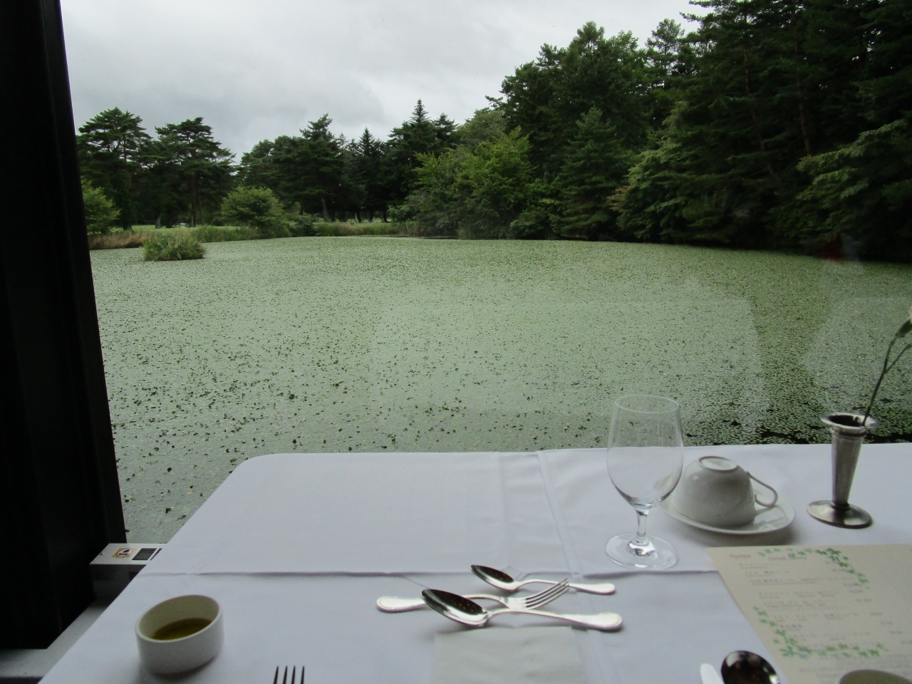 レストランのパノラマウインドーに広がる風景は、ゴルフ場との境にある蓮の葉が浮かんだ大き目の池越しにグリーンのゴルフ場が見えて、なかなか良いロケーションでした。