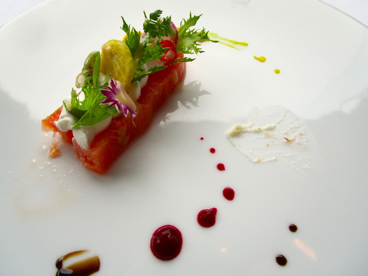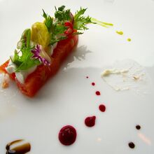 前菜:信州産サーモンのミキュイ 庭園風サラダ仕立て ポテトのエクラビ添え