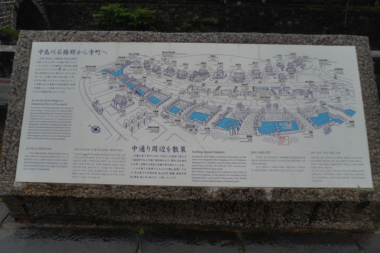 長崎市内を流れる中島川には有名な眼鏡橋を始めとして数多くの石橋が架かっています。常盤橋、袋橋、眼鏡橋、魚市橋、東新橋、芊原橋等々。傍らに案内板がありましたが、図によるとすべて寺町の方に向かう道を通していることが分かります。