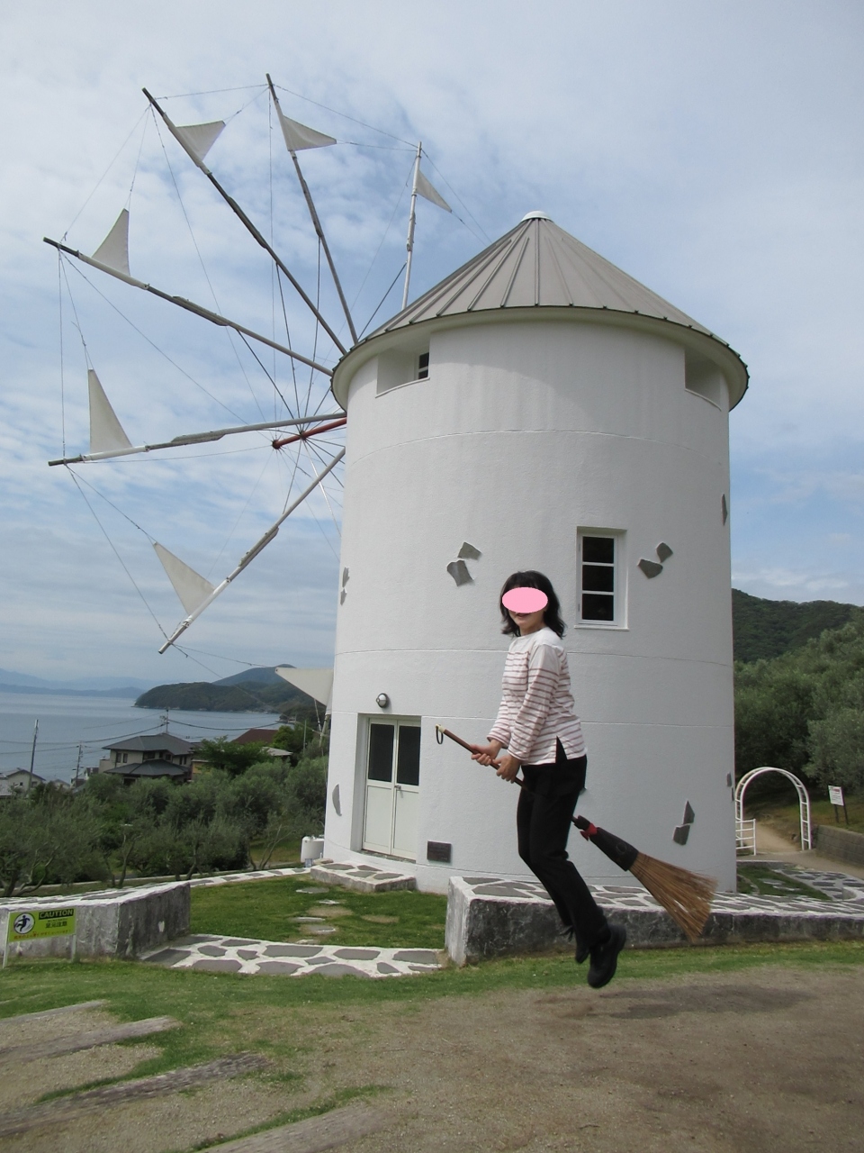 一番人気は、オリーブ記念館で魔女のほうきを借りて、ギリシャ風車の所でほうきで飛ぶショットの撮影です。