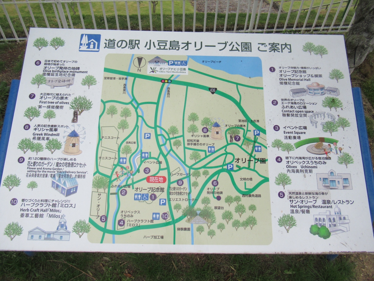 公園内には「オリーブ畑」、地中海ムード満点の「オリーブ記念館」、エーゲ海を思わせる「ギリシャ風車」、天然温泉の「サン・オリーブ温泉」、宿泊施設の「オリベックスうちのみ」などがあります。