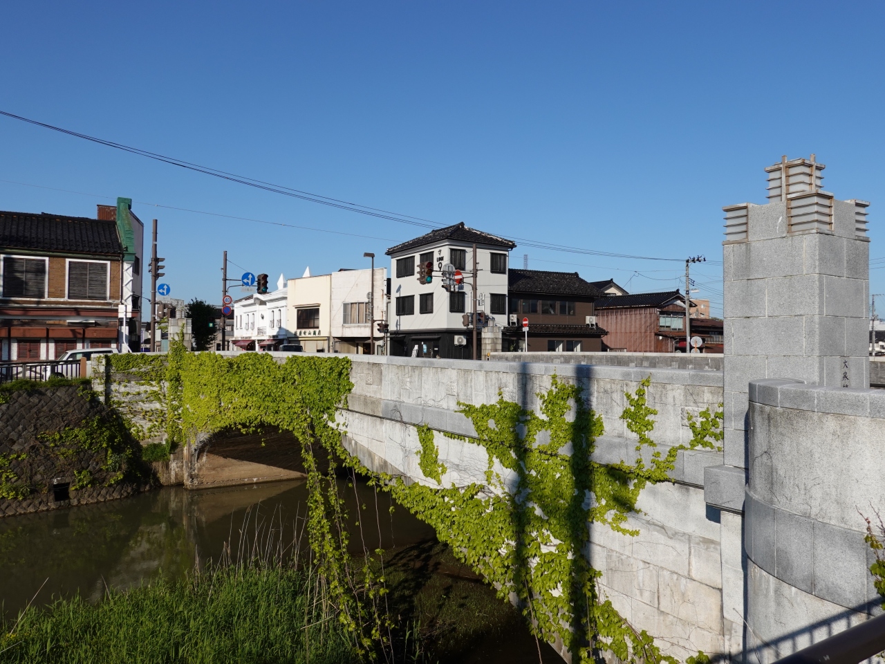 「大泉橋」は、鶴岡市街を流れる内川に架かる橋のひとつで、山王通りを通しています。見るからに歴史を感じる石造りのアーチ橋で、蔦が絡まる光景が印象的でした。藤沢周平作品を映画化した際に、ロケ地にもなったということです。