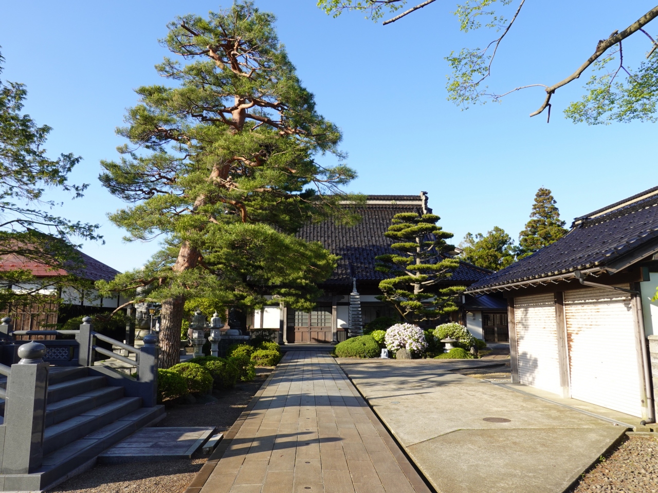 鶴岡駅から南へ400メートルほどの場所にある曹洞宗寺院です。創建は平安時代後期とされる古刹です。山門から本堂までは長い石畳が続き、境内全体は整然とした美しさがあります。藤沢周平の作品「用心棒日月抄」にも描かれており、ゆかりの地として案内板が設置されています。