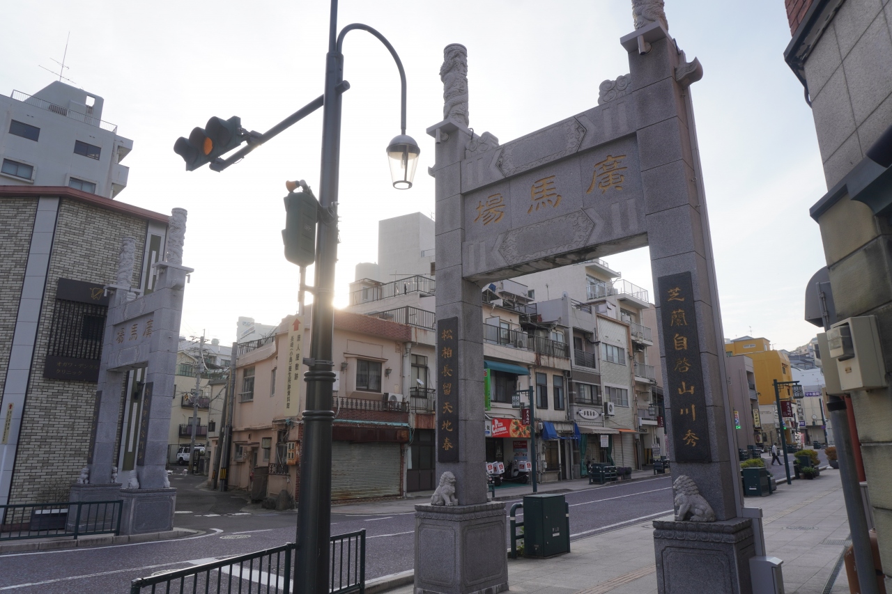 唐人屋敷 誘導門は、唐人屋敷の方に入って行く坂道の入り口に建っている門。左右の歩道に二つの門が対で建っているのですが、灰色の目立たない色調だし、一つ一つでも成り立たなくはないので、もしかしたら二つあることに気が付かない人もいるかもしれません。