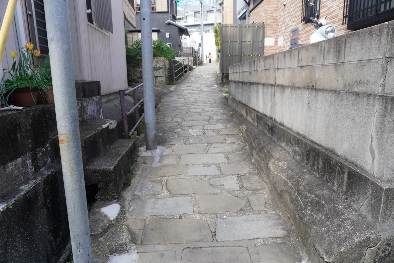 丸山オランダ坂は、電停「崇福寺」から正覚寺の方に上っていったところ。ちょっと裏道のような細い坂ですが、こちらが本当のオランダ坂なんだとか。中ほどに説明板があって、出島に出入りを許されていた丸山の遊女たちがこの坂を通って出島に向かったからオランダ坂なんだということです。