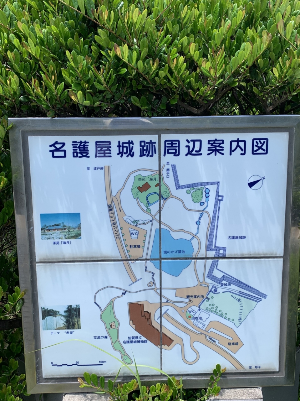 石垣が広範囲にわたって崩されています。築城は1591年に始まり諸大名の割普請でわずか数か月で完成したそうです。江戸時代の初期に破却されたと考えられています。秀吉の文禄慶長の役の拠点とした城です。付近に布陣の案内地図がありものものしい装備であったと想像しました。こんな素晴らしい高台に戦争の拠点を築いたとは残念でした。