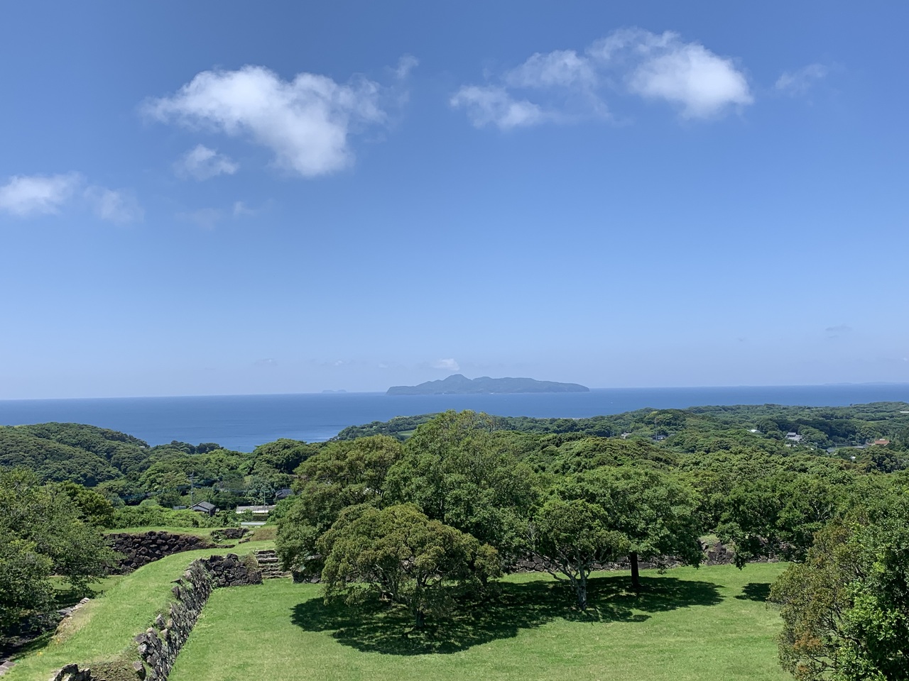 見事な石垣の上に本丸跡があります。広く大きく東西約130メートル、南北約125メートルの本丸跡には天守台や多門櫓の跡、築城初期の石垣の遺構が残っています。天守からは晴れていたので壱岐、対馬を遠望できました。ここから水軍の監視出航を見ていたのかもしれません。とにかく眺めが最高の素晴らしい場所にありました。