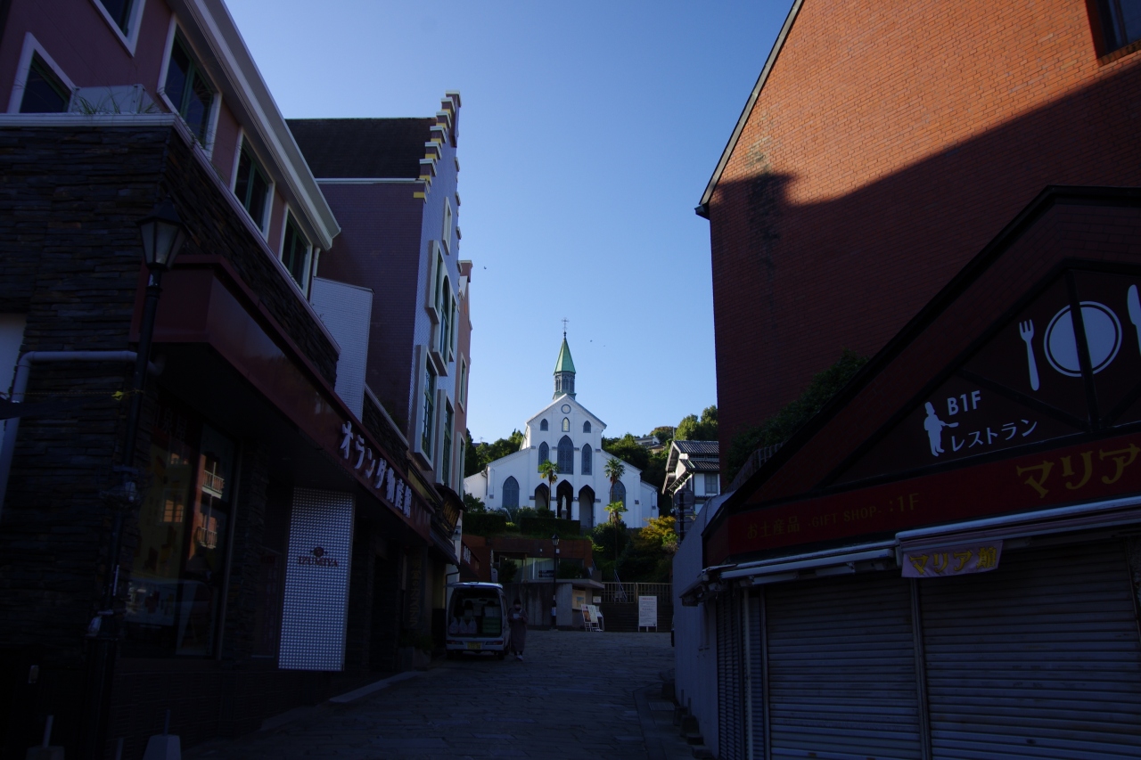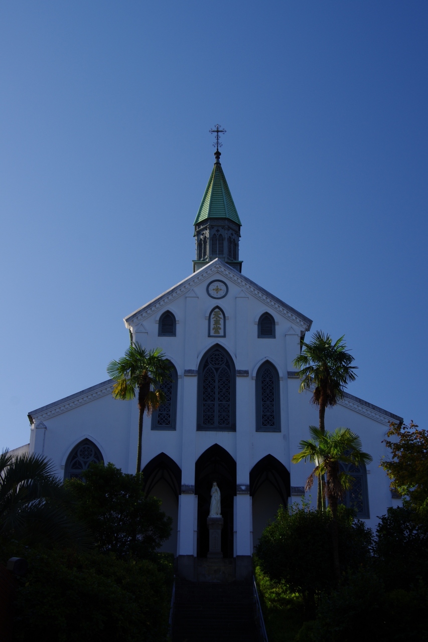 天草、平戸、福江島でいろいろな教会を見てきたけど、本場?長崎の教会はやはり立派。グラバー園への登り道の途中にあるのでとても目立っている。規模が大きく、前庭にあるヤシの木ともあいまって、異国情緒ある長崎を代表する景観のひとつと思った。