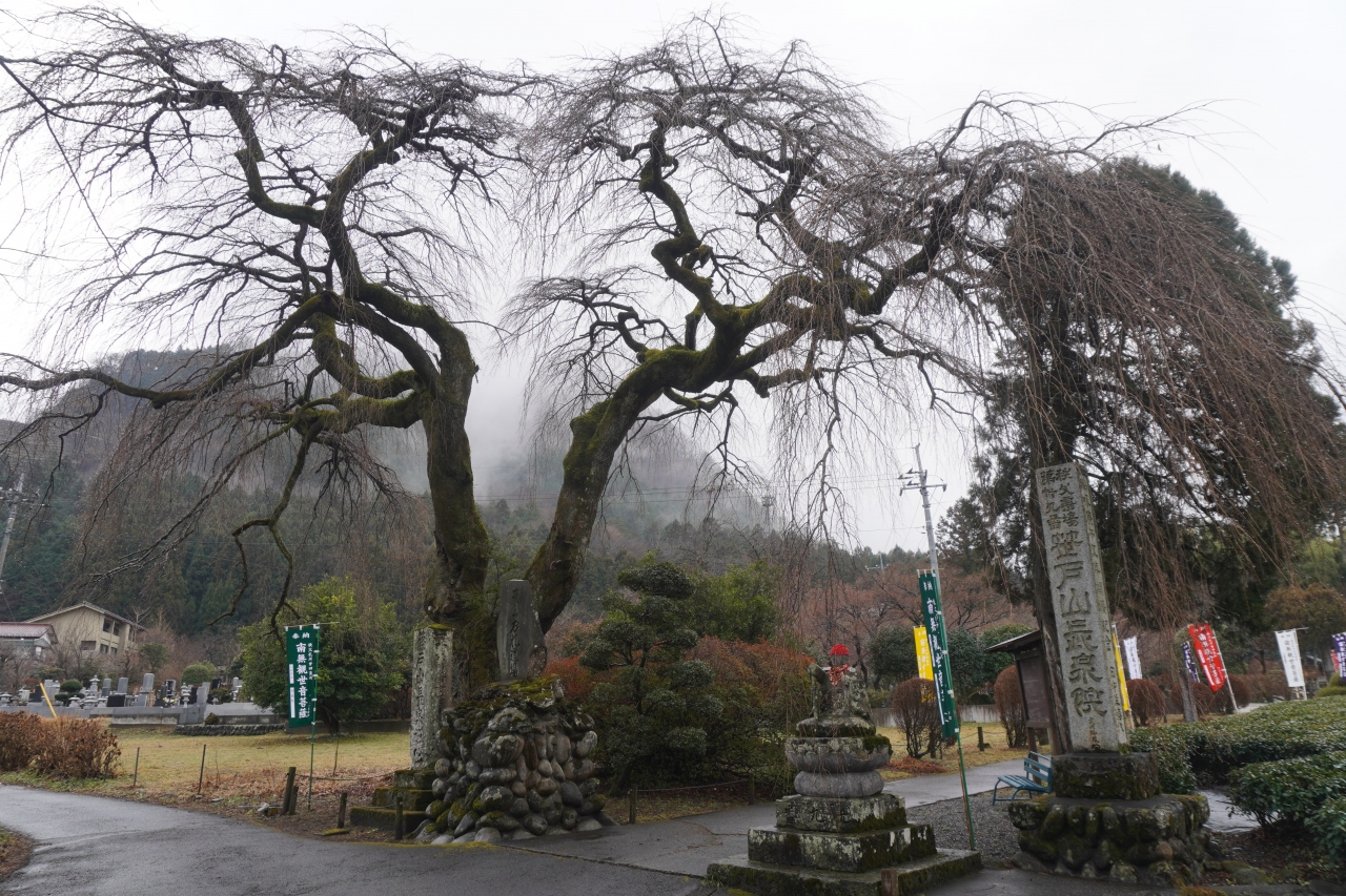 まず目に入るのは、参道入り口の見事な枝垂れ桜。よみがえりの一本桜というらしいですが、枝ぶりとか独特の雰囲気がありますね。巨大な幅広の本堂がちょっと異様で、正面に掛けられた龍女の絵馬と白い漆喰に貼られた千社札の眺めも妖気が漂っているような感じです。